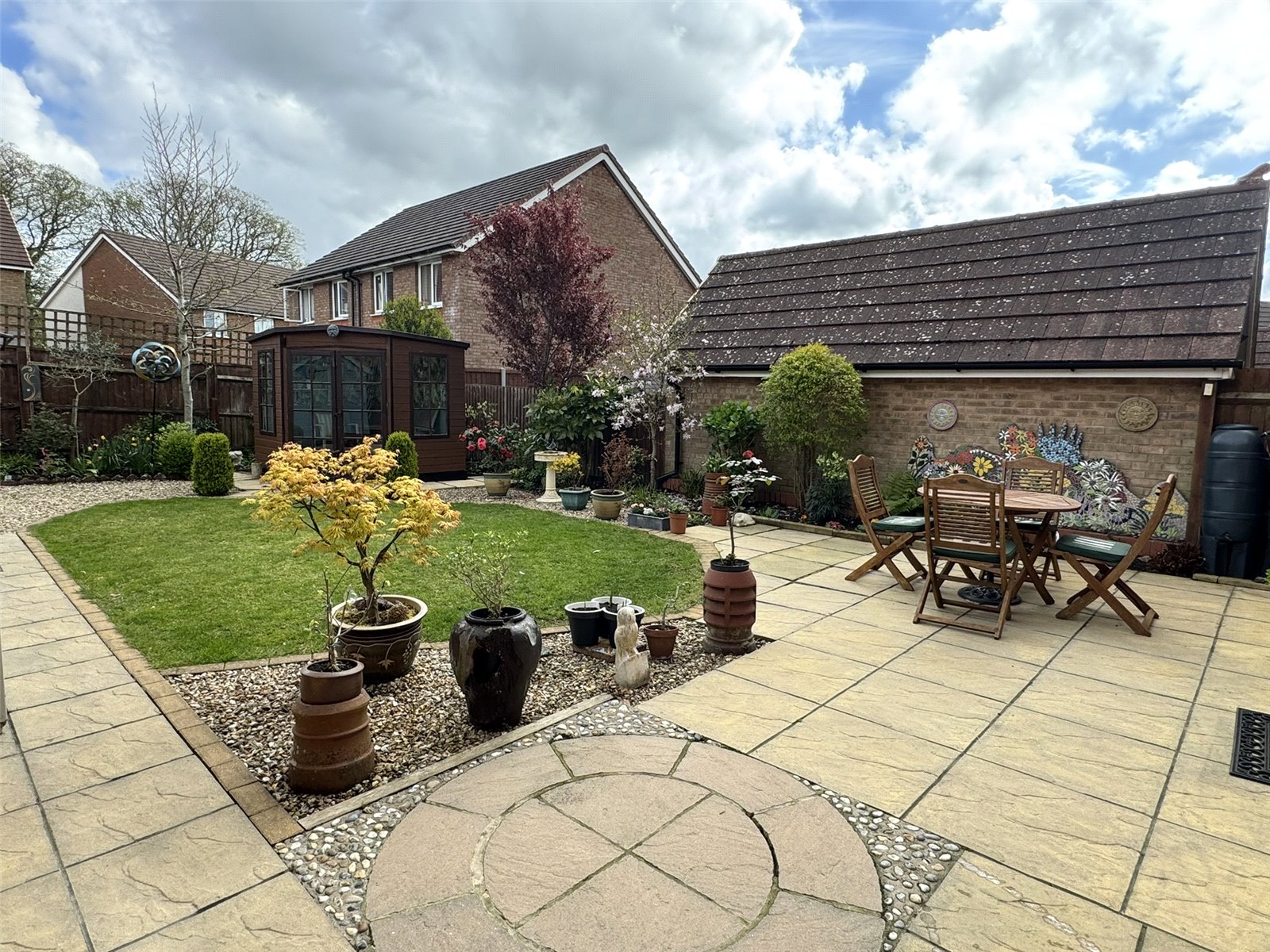 A tarmac driveway to the side provides off street parking and gives access to the detached garage. A wooden gate leads into the rear garden. The rear has been beautifully landscaped by the current owner with extensive planting. There is a large patio seating area with doors into the kitchen, a pathway leads to the rear of the garden with an additional seating area, a wooden storage shed with power and summerhouse. The whole enjoys flower borders housing a variety of mature plants and shrubs enclosed by wooden panelled fencing.