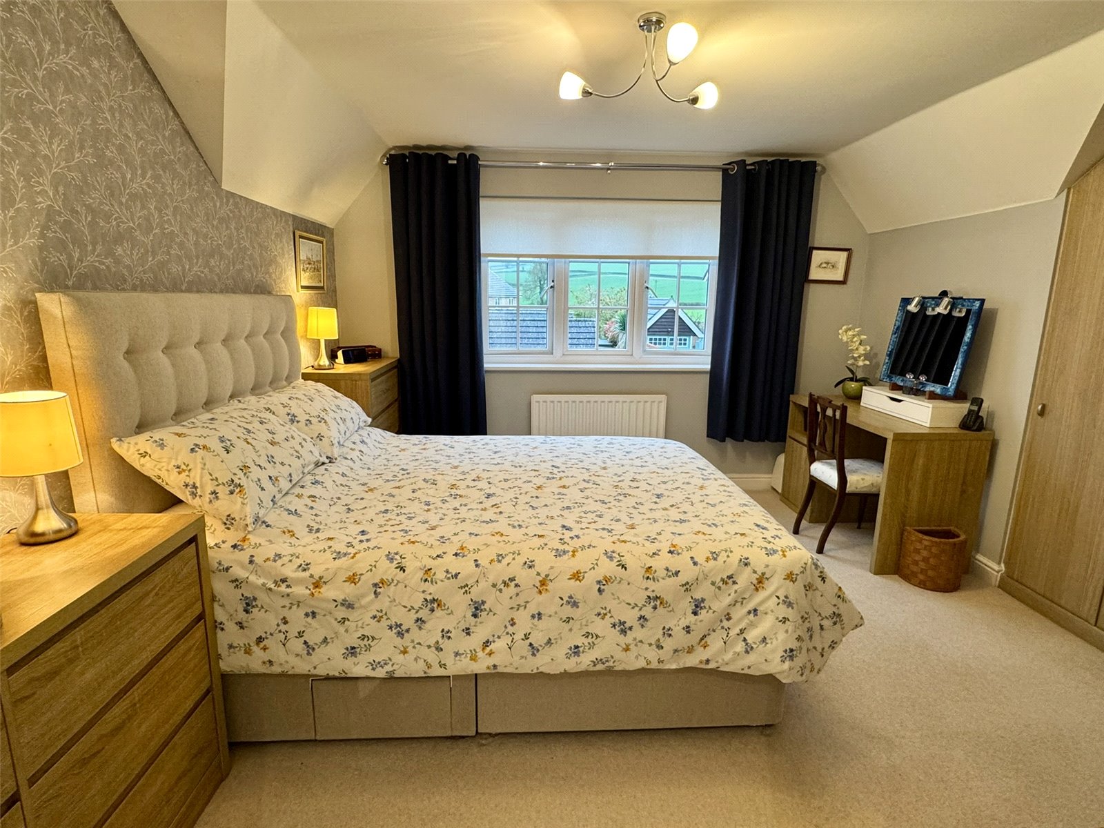 Master Bedroom 12'2" x 11'10" (3.7m x 3.6m). Fitted wardrobes, radiator and double glazed window to the front aspect with views between rooftops of fields and countryside beyond. Door into