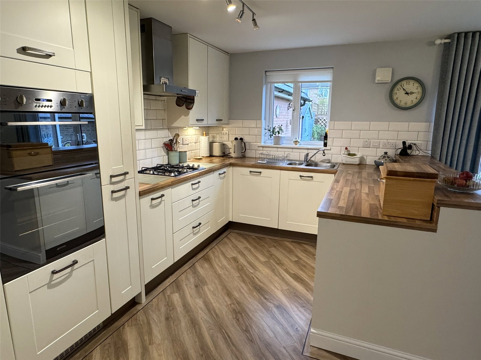 Kitchen/Diner/Breakfast Room 25'1" x 12'3" (7.65m x 3.73m). Laid to an open plan design spanning the entire width of the rear of the house providing an excellent entertaining space. Kitchen fitted with a range of matching wall, base and display units with additional breakfast bar set beneath wooden worktops with integrated stainless steel one and a half bowl sink and drainer. Integrated 'Smeg' appliances consisting of elevated oven and grill, fridge/freezer, dishwasher and inset four burner gas hob with stainless steel hood over. Television point and understairs storage cupboard. Two double glazed windows to the rear aspect with sliding patio doors out to rear patio. Door into Utility room.