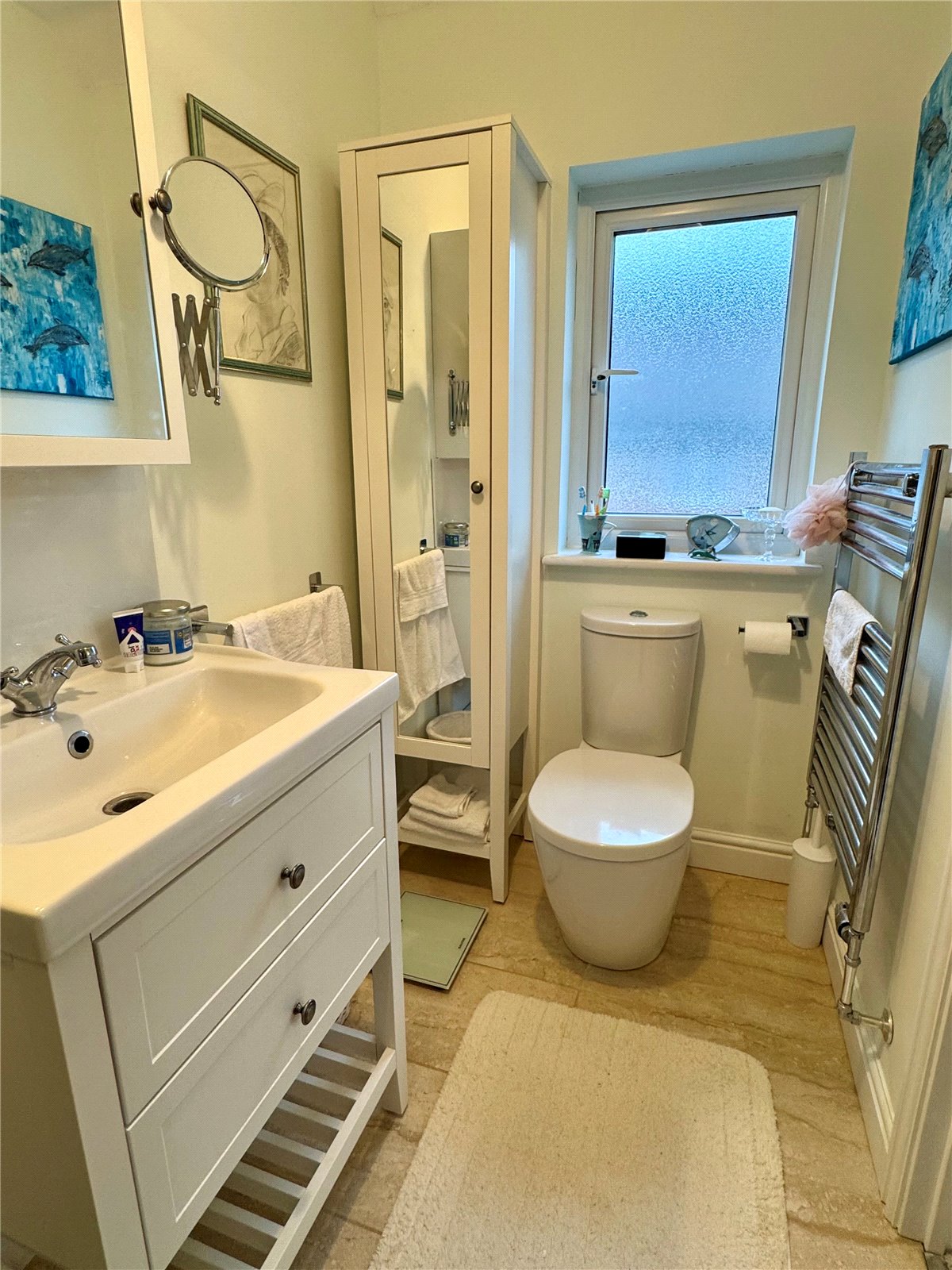 Cloakroom Fitted with a two-piece suite consisting of close coupled W.C and wall mounted corner wash hand basin. Tiled flooring, radiator and opaque double glazed window to the front aspect.