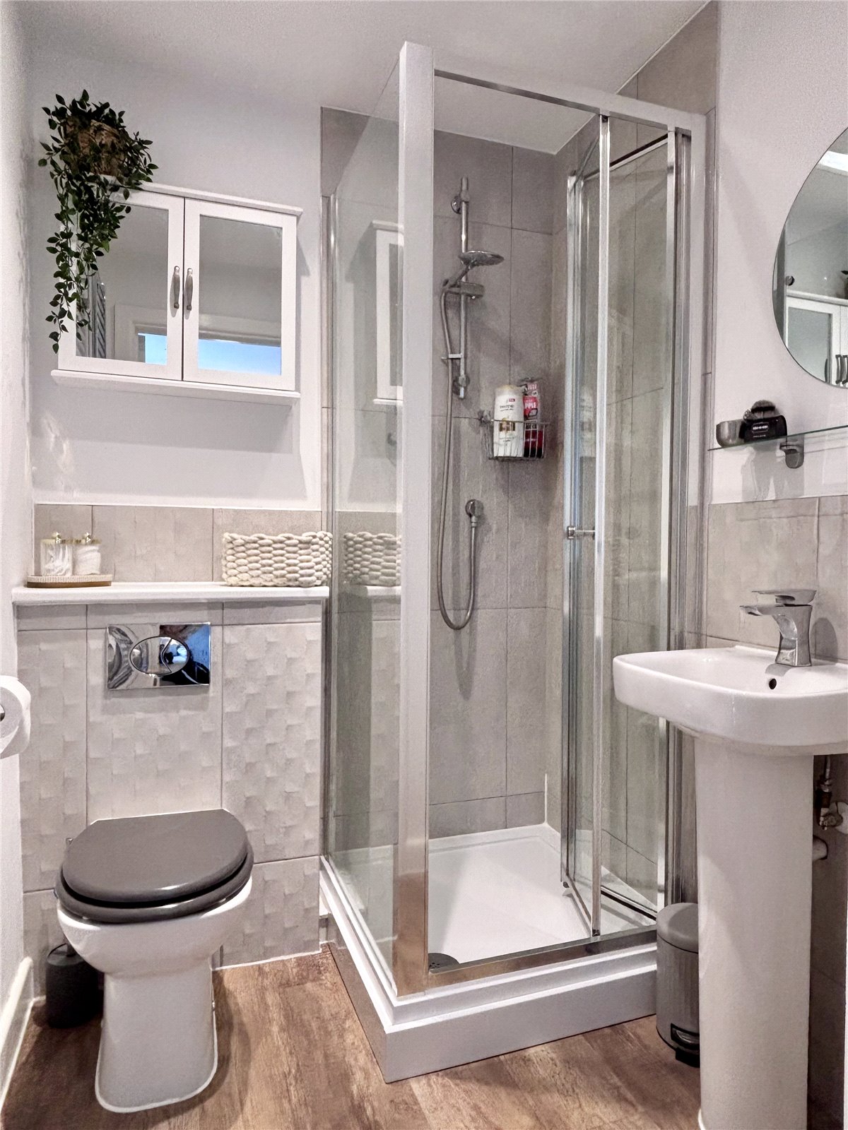 Ensuite Shower Room Fitted with a three piece suite comprising of shower cubicle with mains shower, pedestal wash hand basin and back-to-wall W.C. Heated towel rail, spotlights, extractor and extensive tiling.