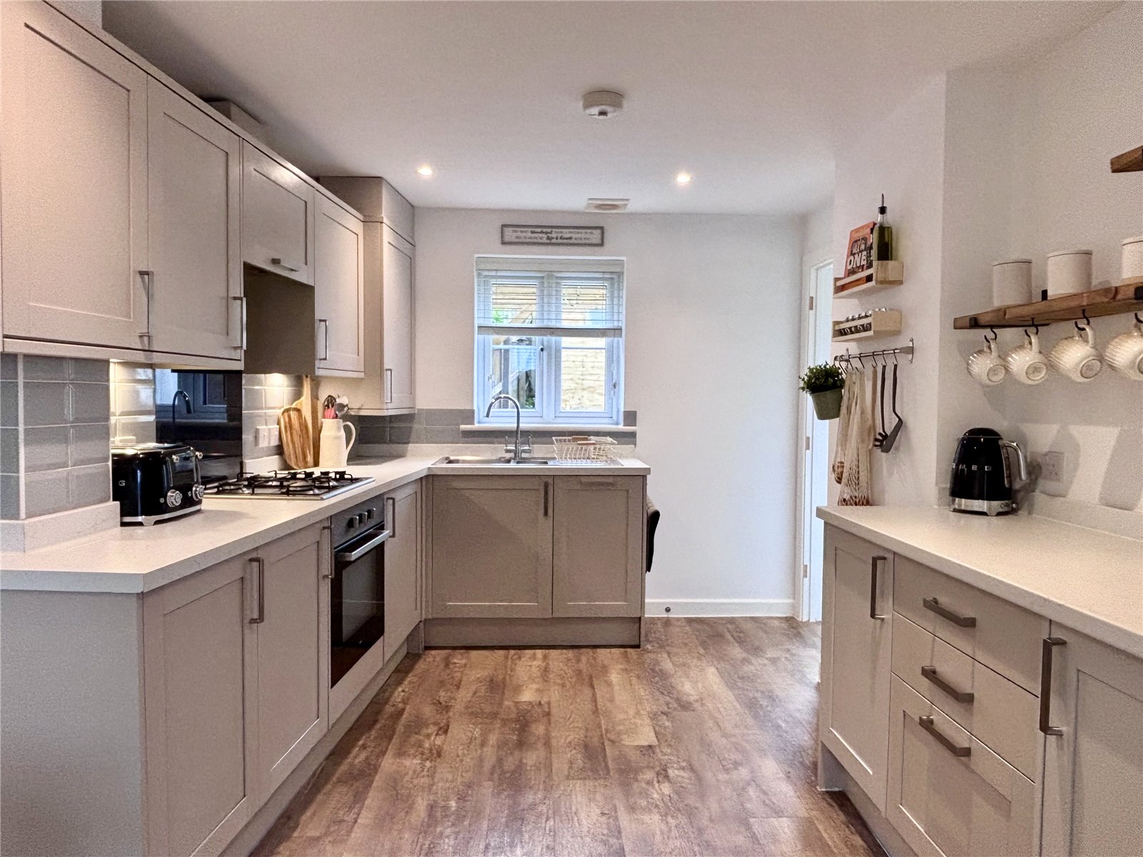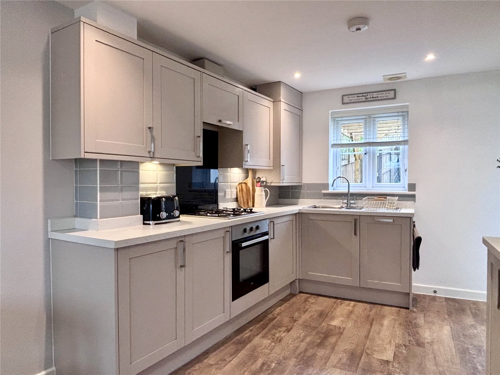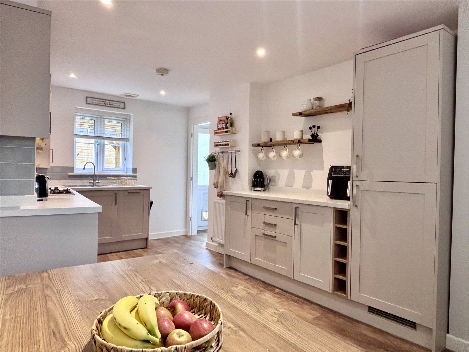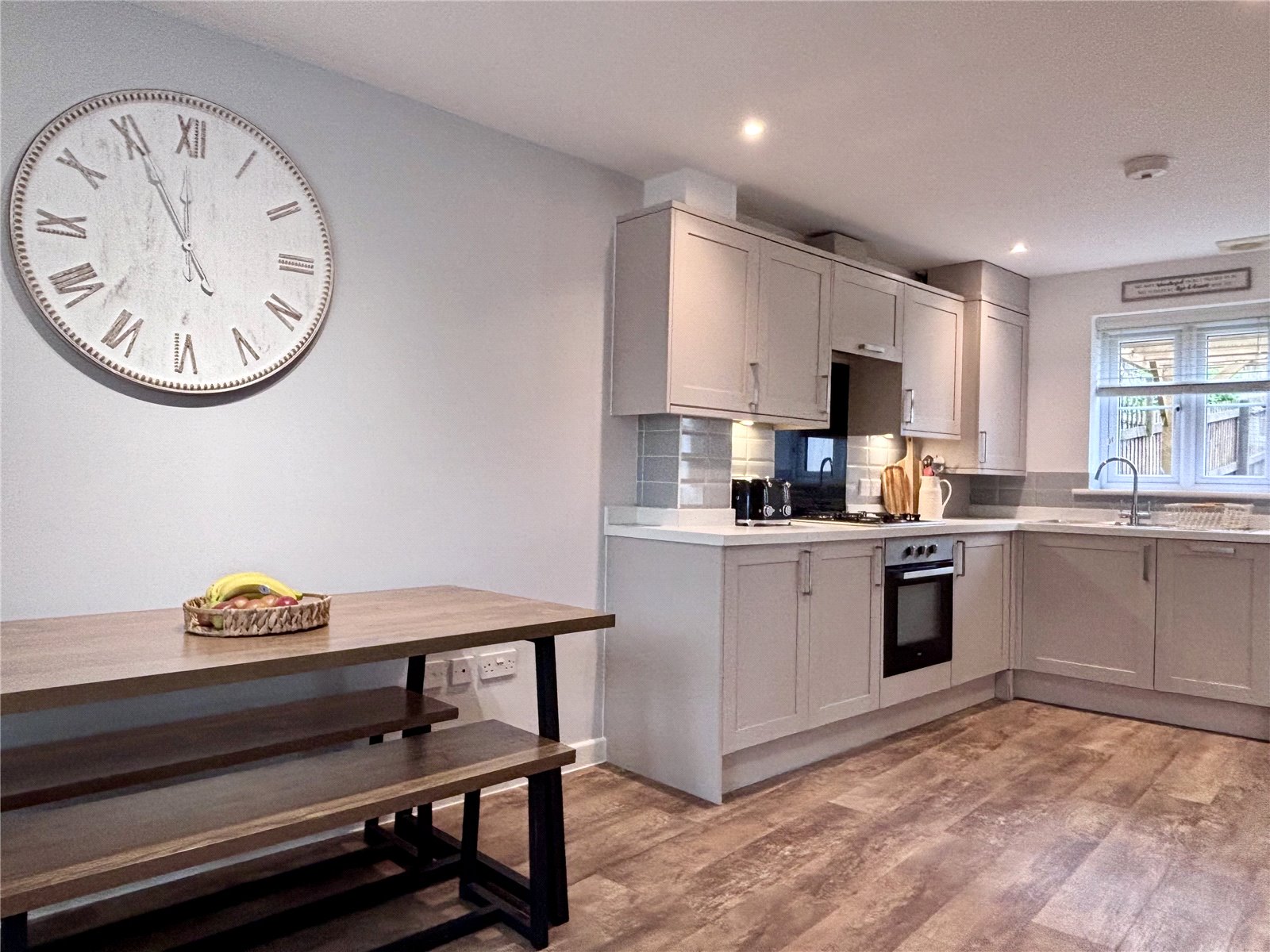 The contemporary kitchen/diner is fitted with a selection of stylish shaker-style wall and base units and comes fully equipped with integrated appliances, including a slimline dishwasher, washing machine, fridge/freezer, oven, and inset gas hob with extractor hood and glass splashback.