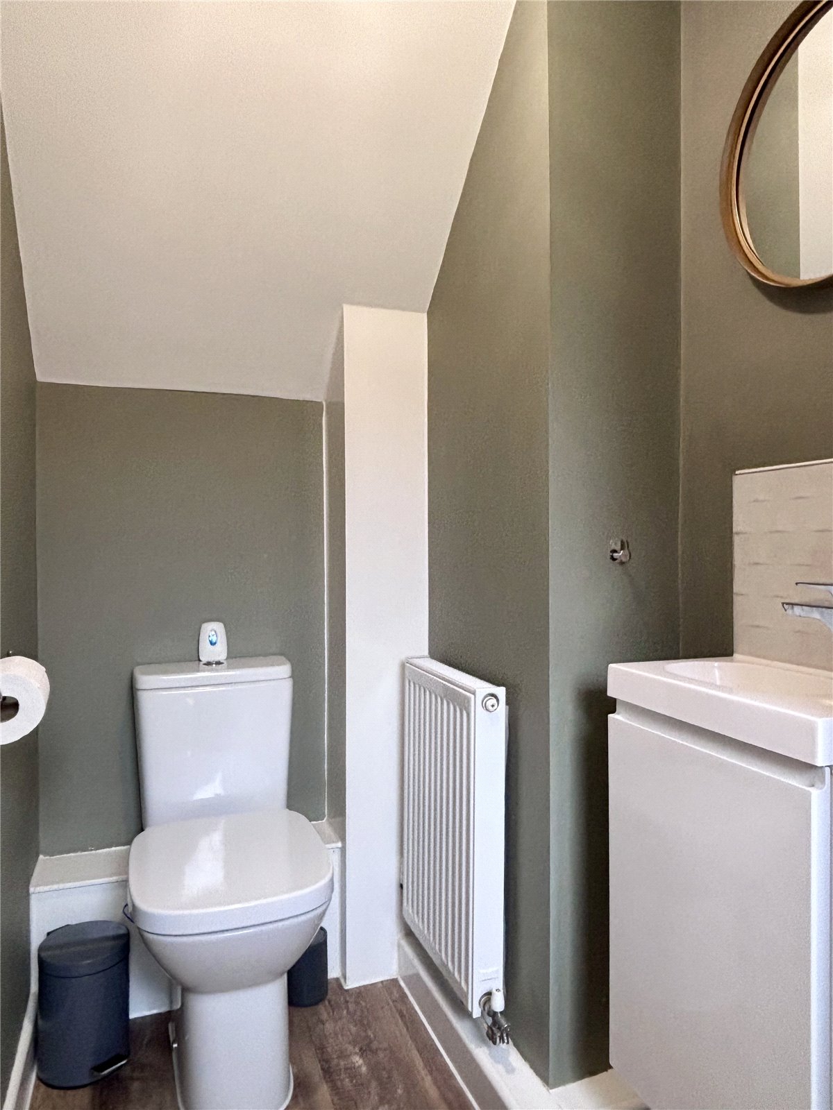 Cloakroom Fitted with a two piece suite consisting of low level W.C and inset wash hand basin with vanity unit under. Radiator, tiled splash back and extractor.