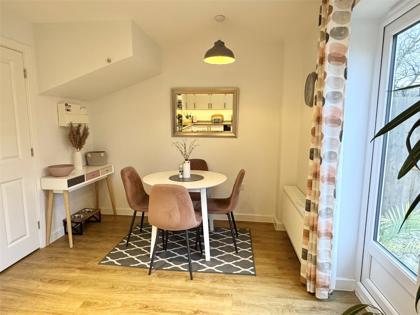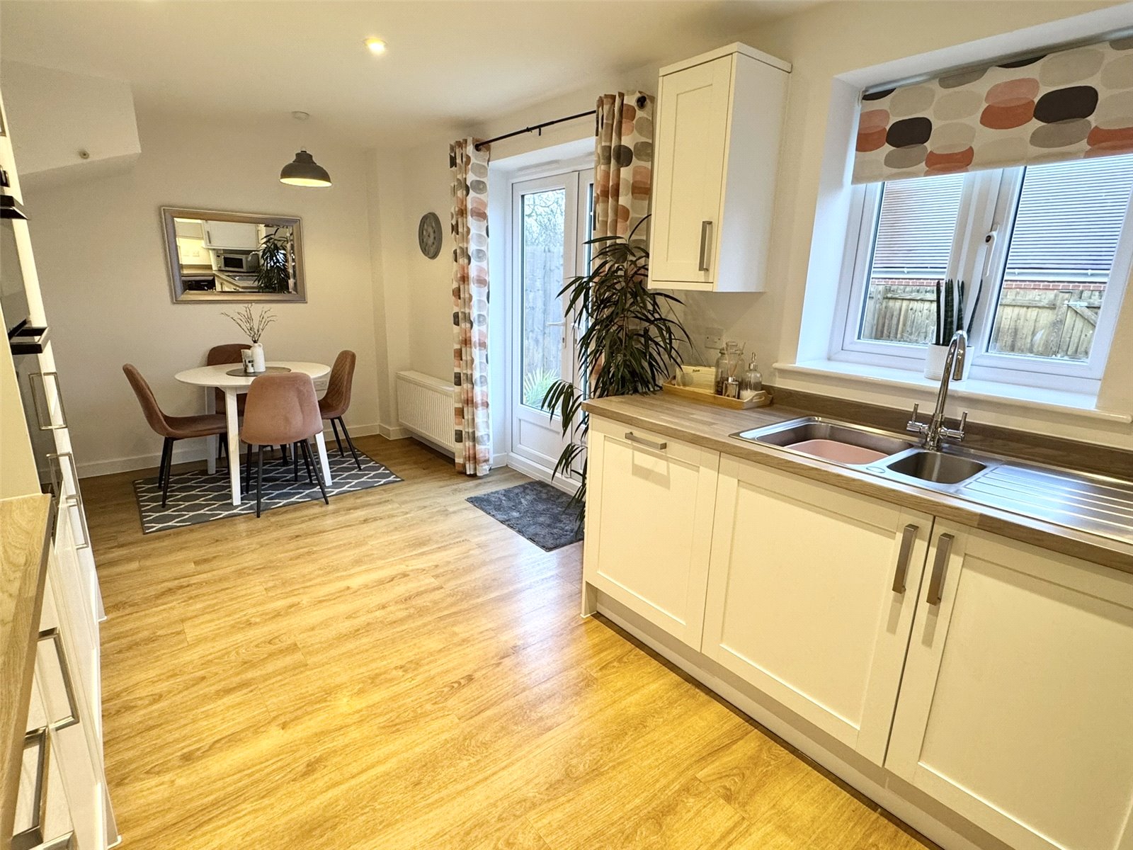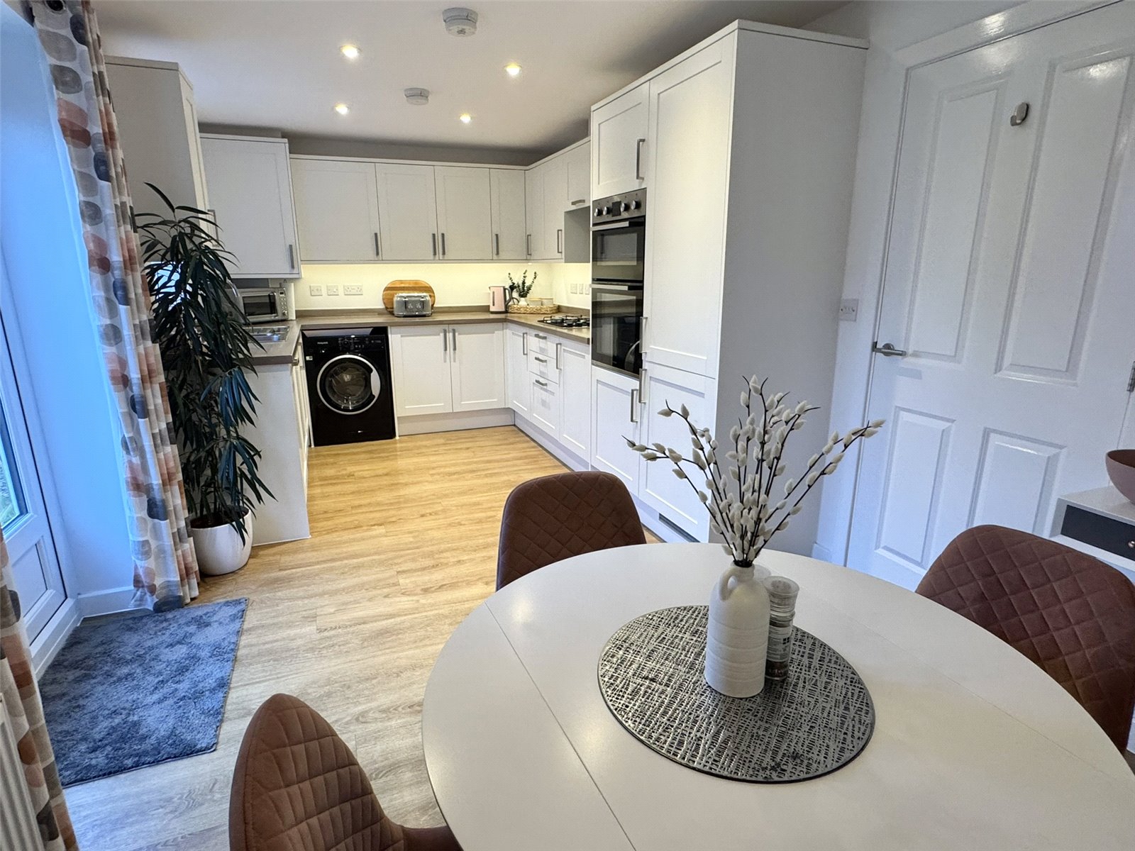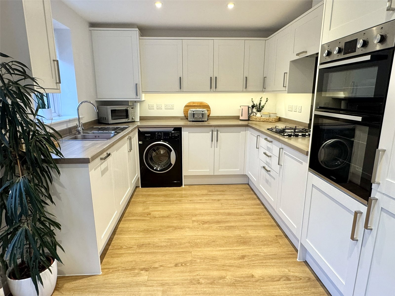 The ground floor is thoughtfully laid out and features an impressive 18ft kitchen/diner fitted with contemporary wall and base units and a range of integrated appliances, including a dishwasher, fridge freezer, elevated double oven and four-burner gas hob. There is ample space for a dining table, while double doors open directly onto the rear garden, creating an excellent space for everyday living and entertaining.