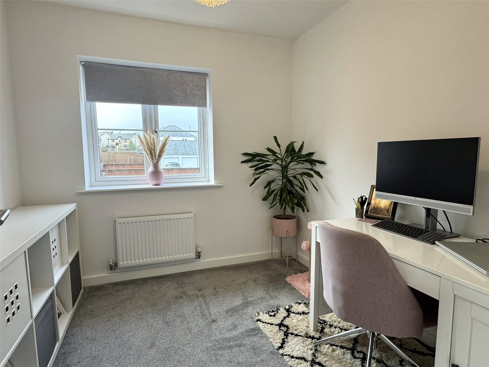 On the first floor are two generous double bedrooms, along with a third bedroom currently utilised as a home office. The family bathroom is fitted with a high-quality three-piece suite featuring Roca sanitaryware.
