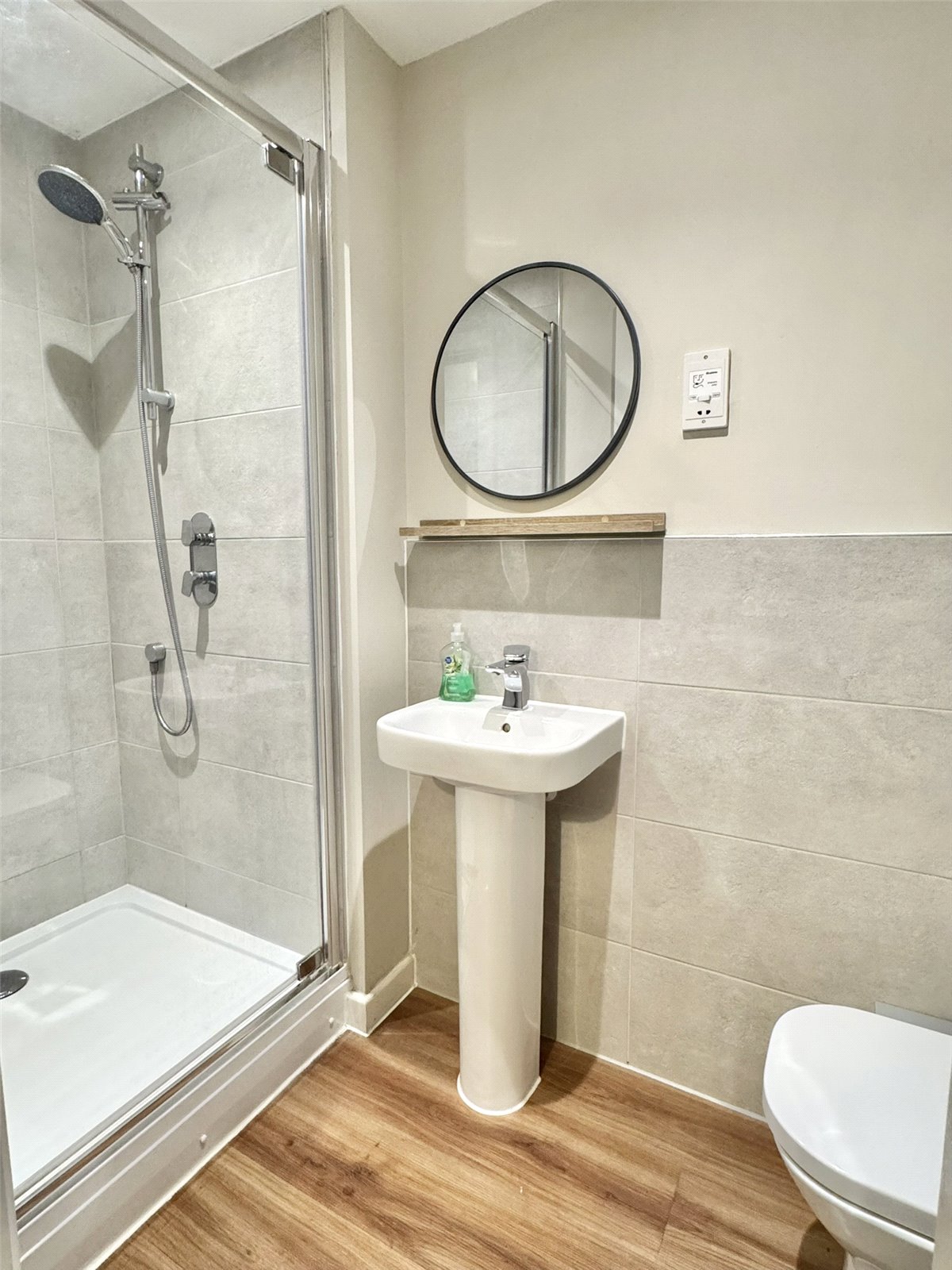 Ensuite Shower Room Fitted with a modern three-piece suite comprising shower cubicle with mains shower, low-level W.C. and pedestal wash hand basin. Heated towel rail, shaving point, extractor, spotlights.
