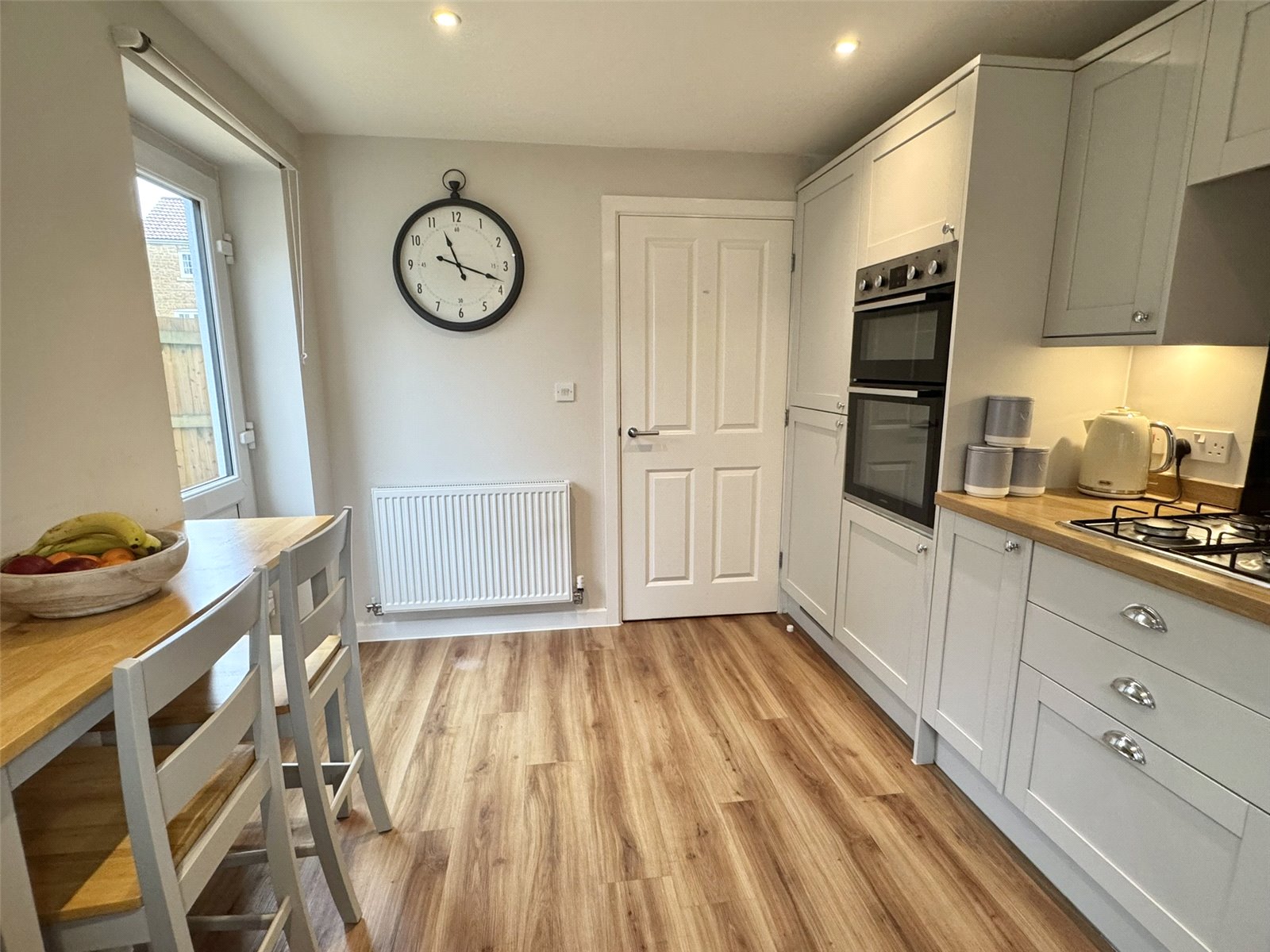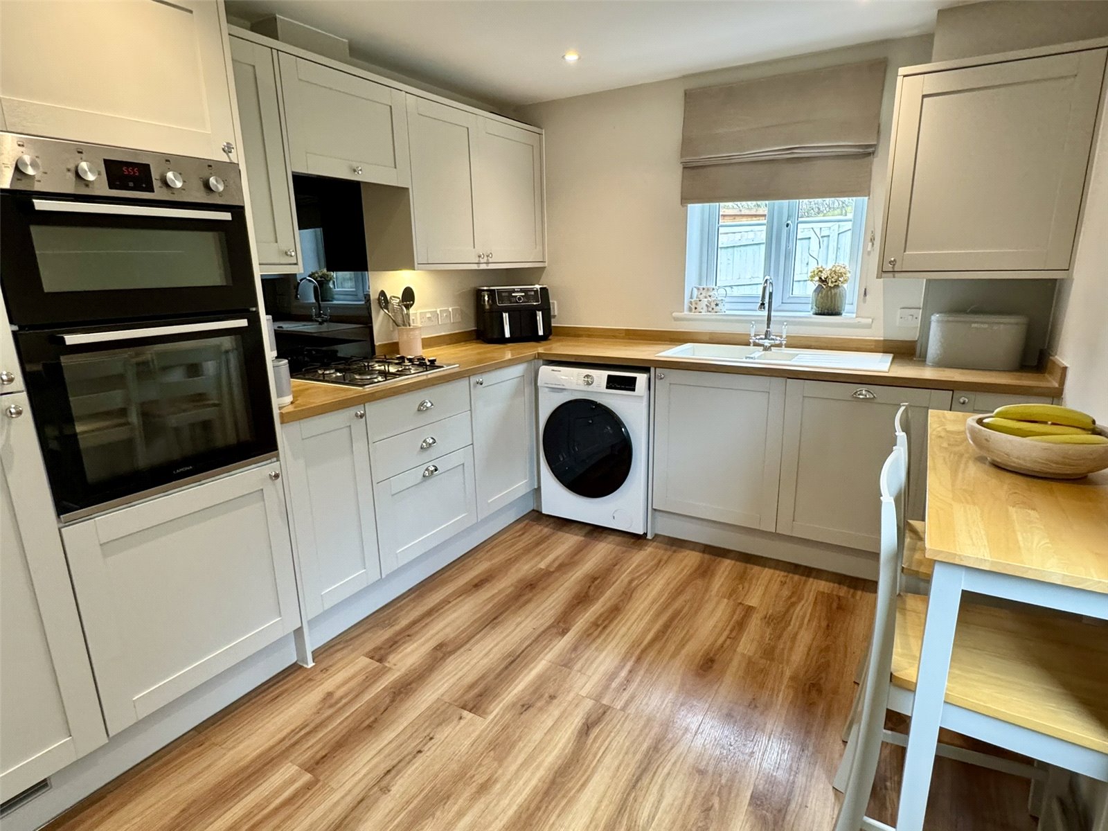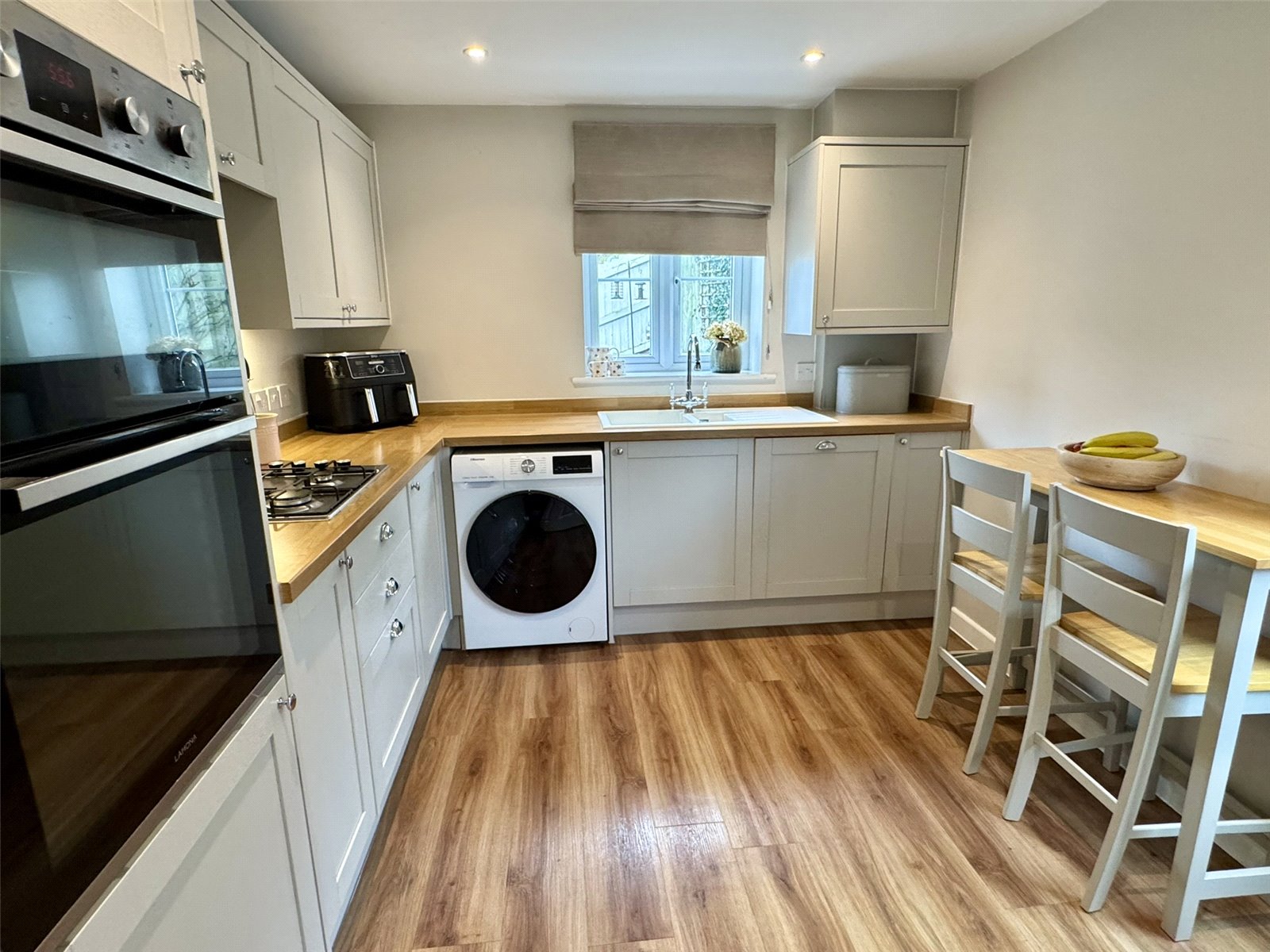 The fitted ?shaker? style kitchen is both modern and practical, offering a range of wall and base units complemented by integrated appliances including a fridge freezer, dishwasher and double oven. A gas hob with sleek glass splashback and extractor hood completes the space, providing a stylish and functional environment for cooking with space for a table.