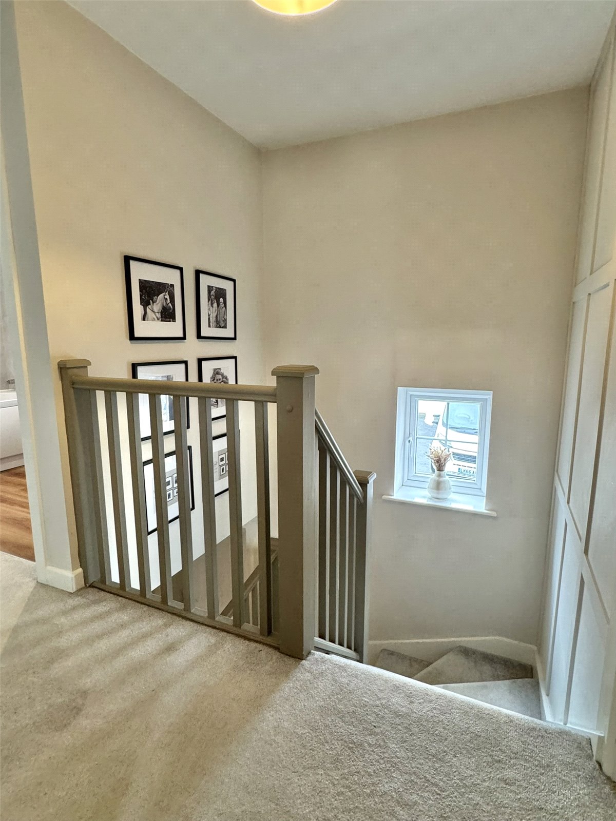 First Floor Landing Galleried landing with decorative wall panelling and double glazed window to the front aspect. Built-in storage cupboard with slatted shelving, access to roof void and doors to all principal rooms.
