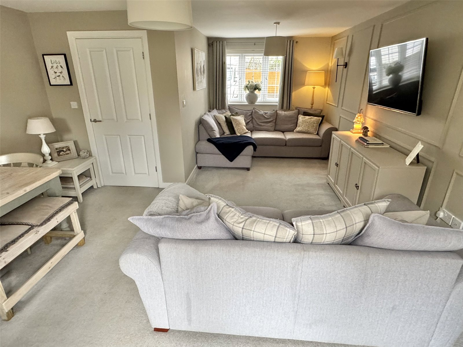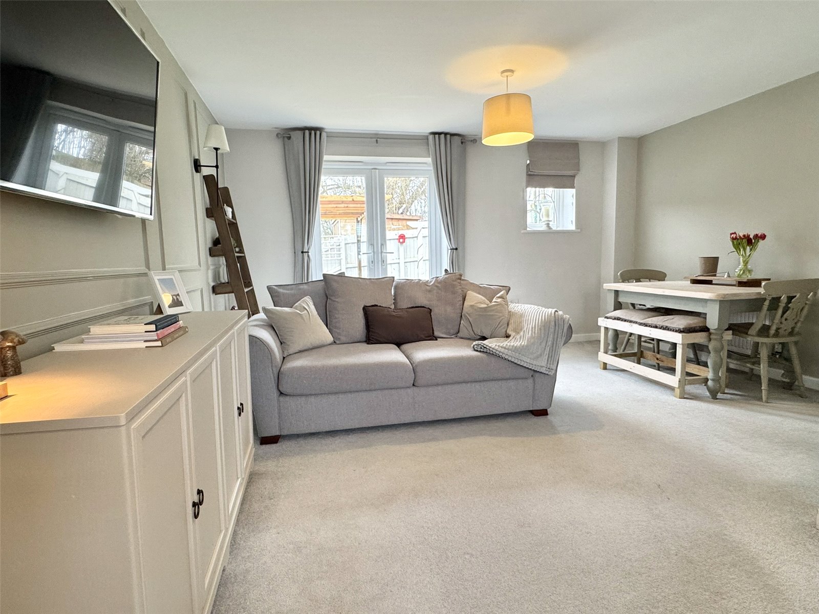 The property is in excellent condition and has been thoughtfully maintained, making it ready for immediate occupation. Upon entering, you are welcomed into bright and inviting interior, with the standout feature being the superb L-shaped lounge/diner. This generous dual-aspect reception space is flooded with natural light and enhanced by attractive feature wall panelling, creating a contemporary yet cosy feel. Double doors open directly onto the rear garden, seamlessly blending indoor and outdoor living ? perfect for entertaining or relaxing with family.