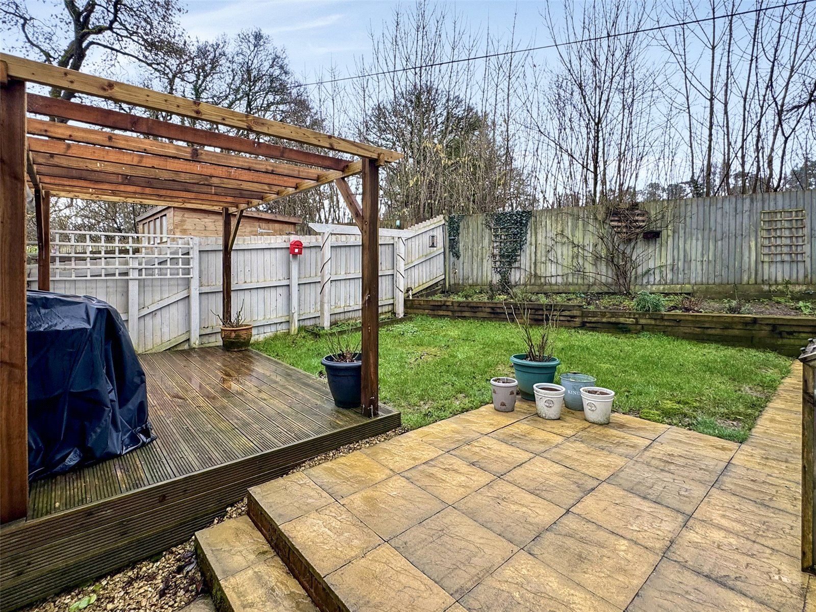 A side garden is laid to paving with raised borders and outside power point with door into kitchen. The path continues through to the rear that is made up of a patio seating area, lawn and a decked wooden Pergola providing a great space for entertaining. Raised orders house mature planting. A wooden gate gives access to the driveway and a personal door gives access into the garage. Outside tap.