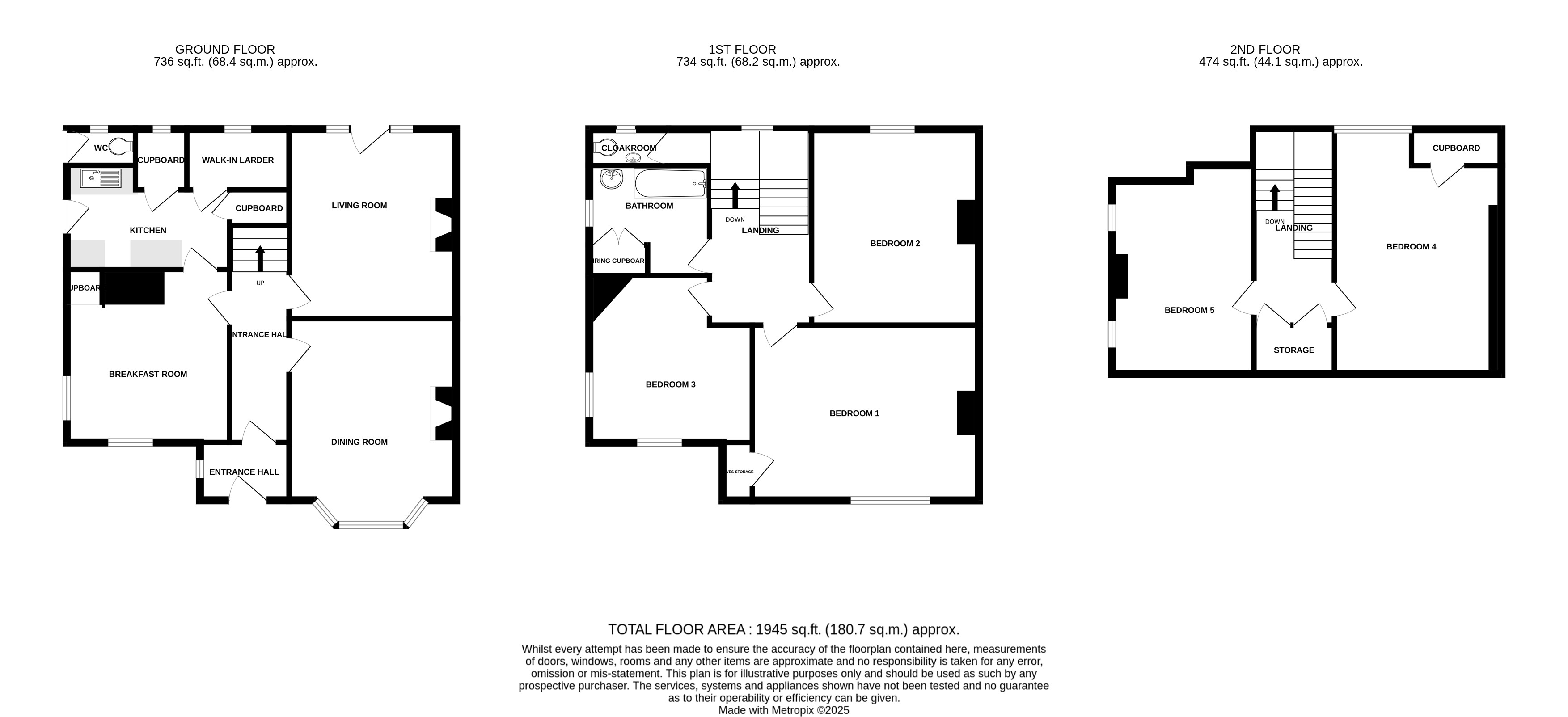 The ground floor features three versatile reception rooms, including a formal living room with period fireplace, a separate dining room with attractive bay window perfect for entertaining, and a cosy dual aspect breakfast room. A fitted kitchen featuring a walk-in larder and additional utility cupboard, complete the ground floor layout.