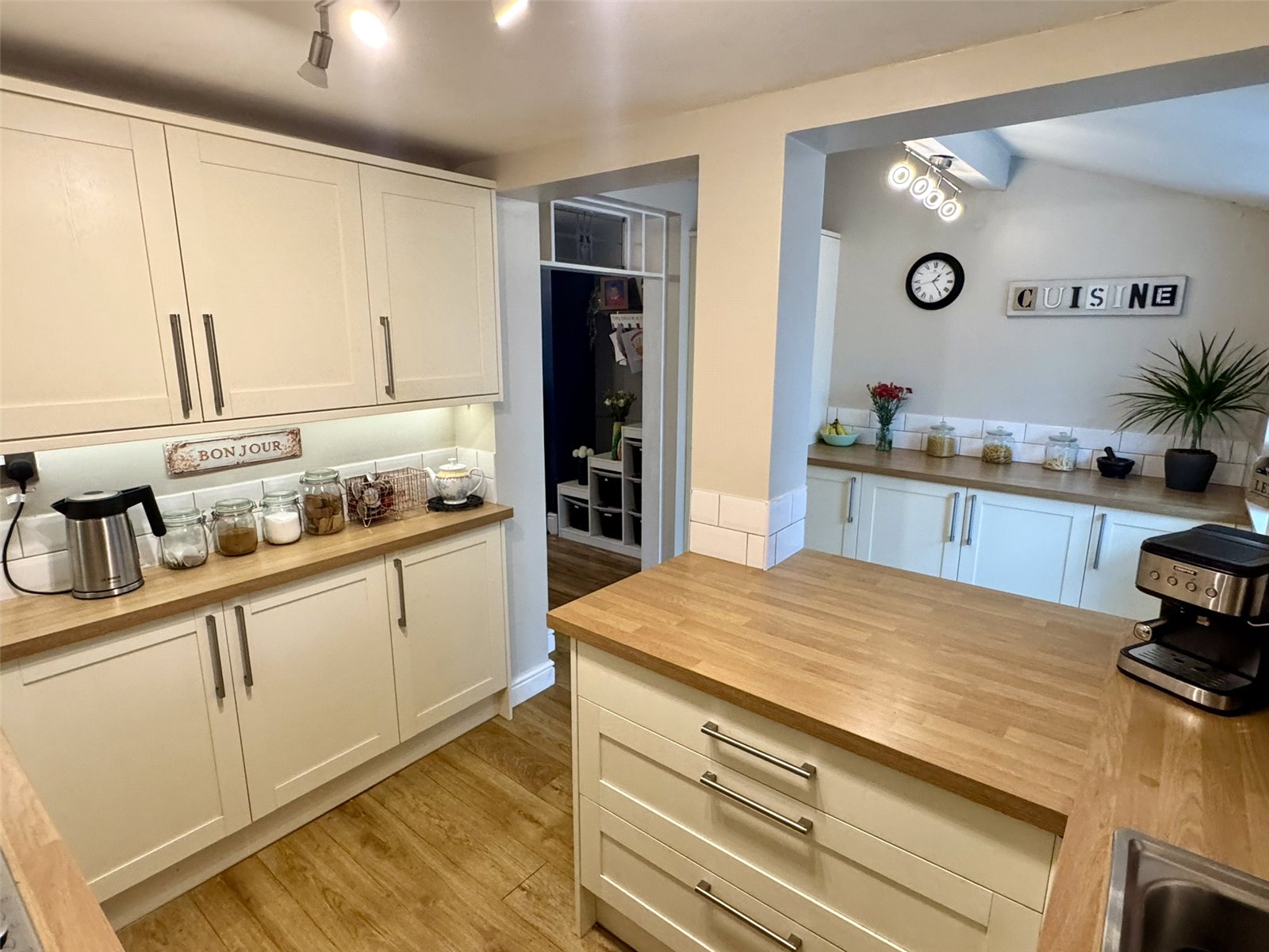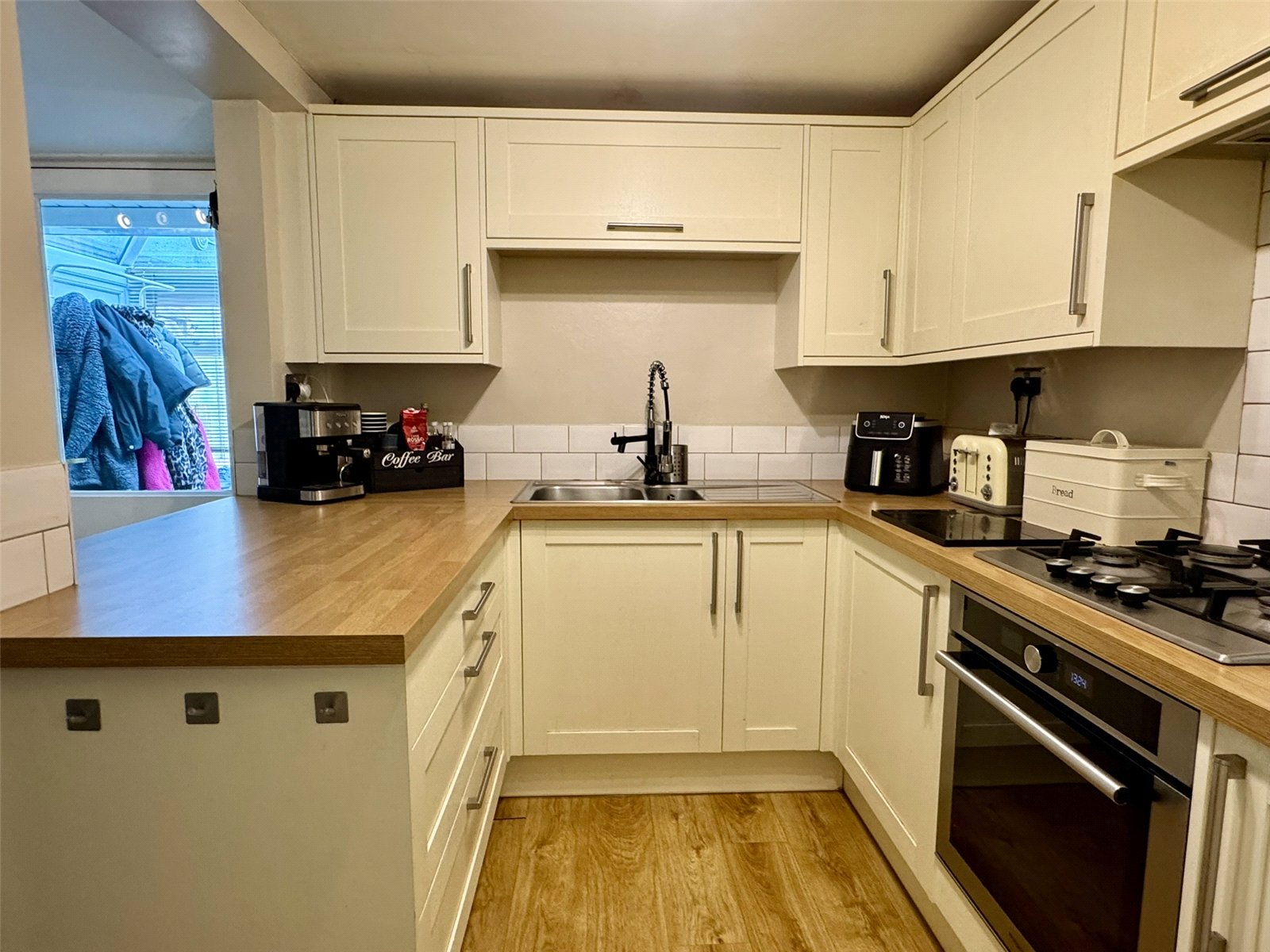 Kitchen 14'8" x 9'5" (4.47m x 2.87m). Fitted with a selection of matching wall and base 'shaker style' units set beneath worktops with inset one and a half bowl sink and drainer with mixer tap. Inset electric oven with gas hob and hood over, integrated fridge freezer. Under unit lighting, tiled splashbacks. Wooden glazed window and door out to utility room.