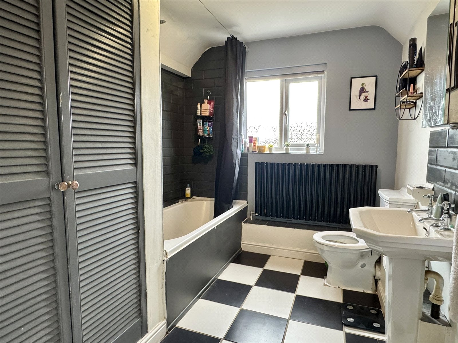 Bathroom Spacious bathroom fitted with a three-piece suite comprising panelled bath with mains shower with rainfall shower head over, low-level W.C. and pedestal wash hand basin. Radiator and opaque double glazed window to the rear aspect. Fitted storage cupboard with wall mounted central heating boiler.