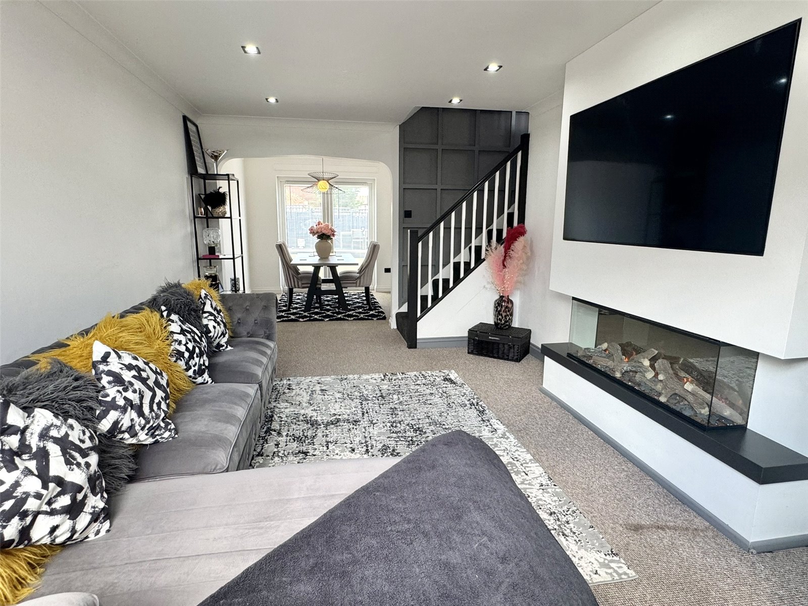 Lounge 16'8" (5.07m) x 10'11" (3.34m) including fireplace. Fitted with a modern sleek media wall with integrated flame effect three-sided contemporary fireplace, modern radiator, spotlights. Double glazed window to the front aspect, stairs rising to first floor and opening through to dining room.