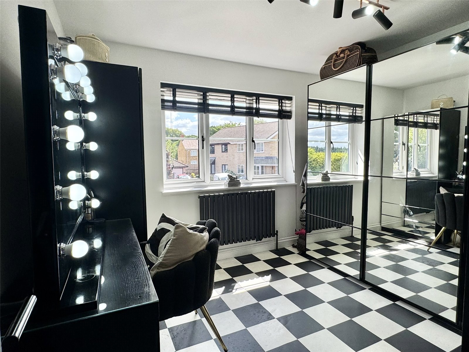 First Floor Landing Fitted with modern decorative wall panelling, access to roof void, built-in storage cupboard overstairs with sensored light. Radiator and double glazed window to the side aspect. Doors to all principal rooms.