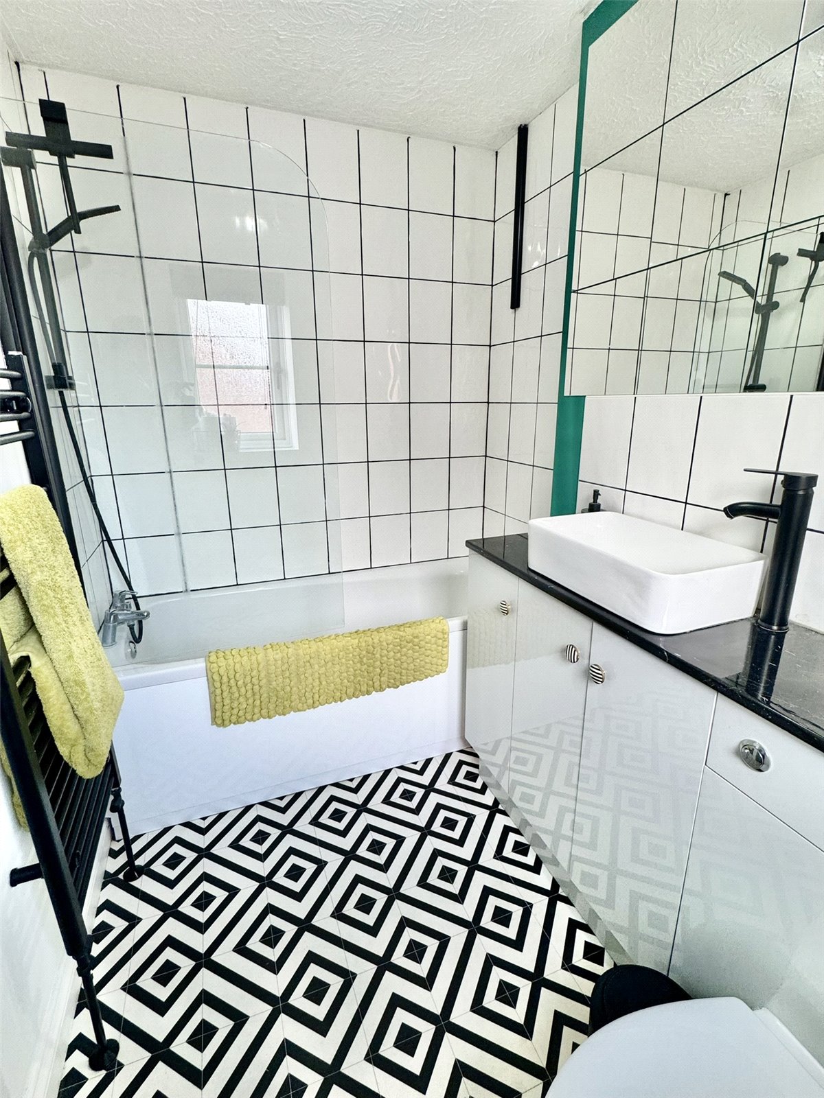 Bathroom Fitted with a three-piece suite comprising panelled bath with mains shower and screen over, back-to-wall W.C. inset sink with storage under. Extractor, shaving point, heated towel rail, tiled flooring, tiled splashbacks and opaque double glazed window to the side aspect.