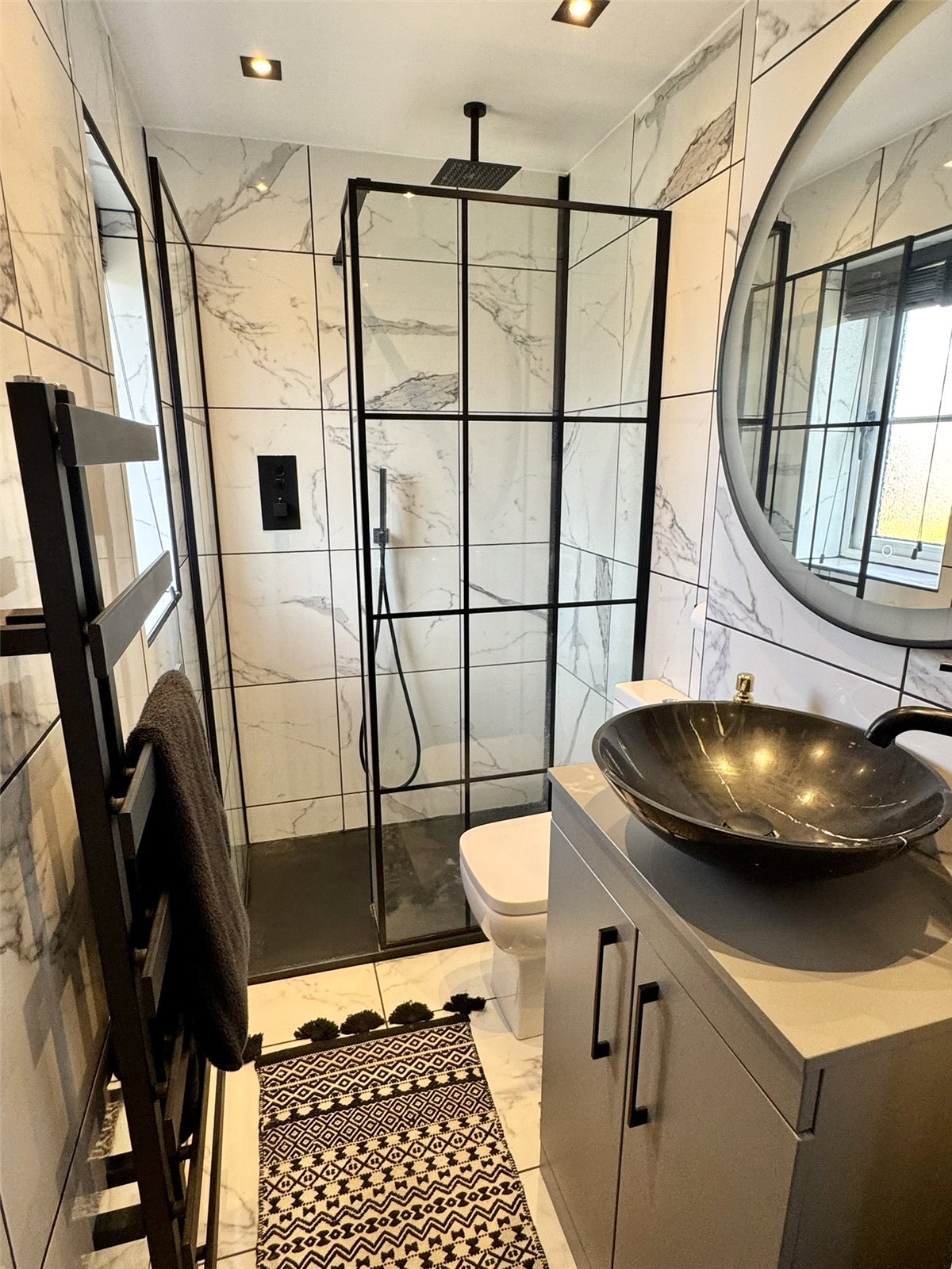 Ensuite Shower Room Beautifully fitted with a stylish modern three-piece suite comprising shower cubicle with mains shower, rain fall shower head and additional shower attachment. Low-level W.C and circular sink with storage under. Fully tiled, modern heated towel rail, spotlights and opaque double glazed window to the side aspect.
