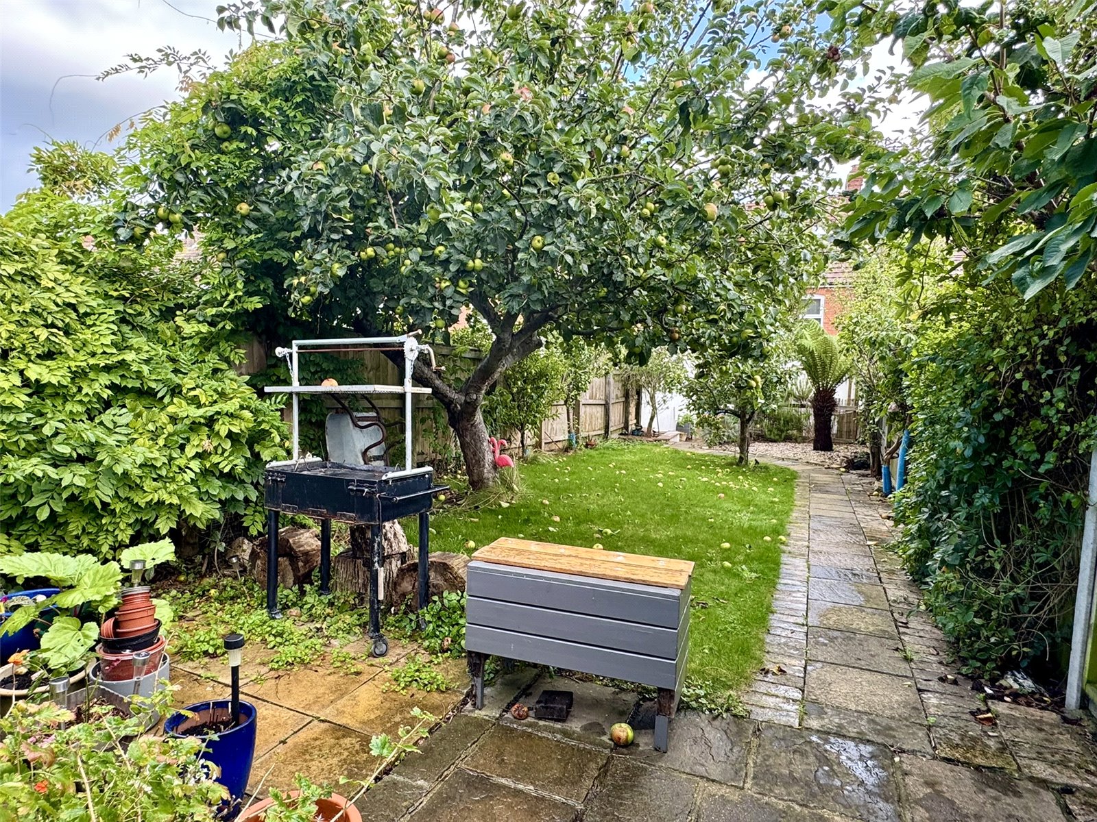 Externally, the property truly excels. A long rear garden offers plenty of space for relaxation and entertaining, featuring a covered seating area and mature fruit trees. At the far end of the garden is a substantial detached garage with power, providing excellent workshop or storage potential, along with off-road parking for two vehicles in front.