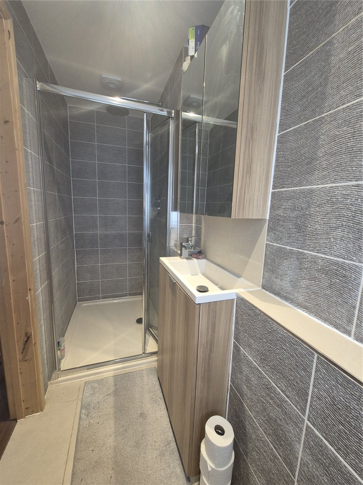 Ensuite Shower Room Benefiting from a three piece suite comprising of W.C, wash hand basin with storage below and shower cubicle. Ceramic tiling, heated towel rail, extractor fan and uPVC double glazed window.