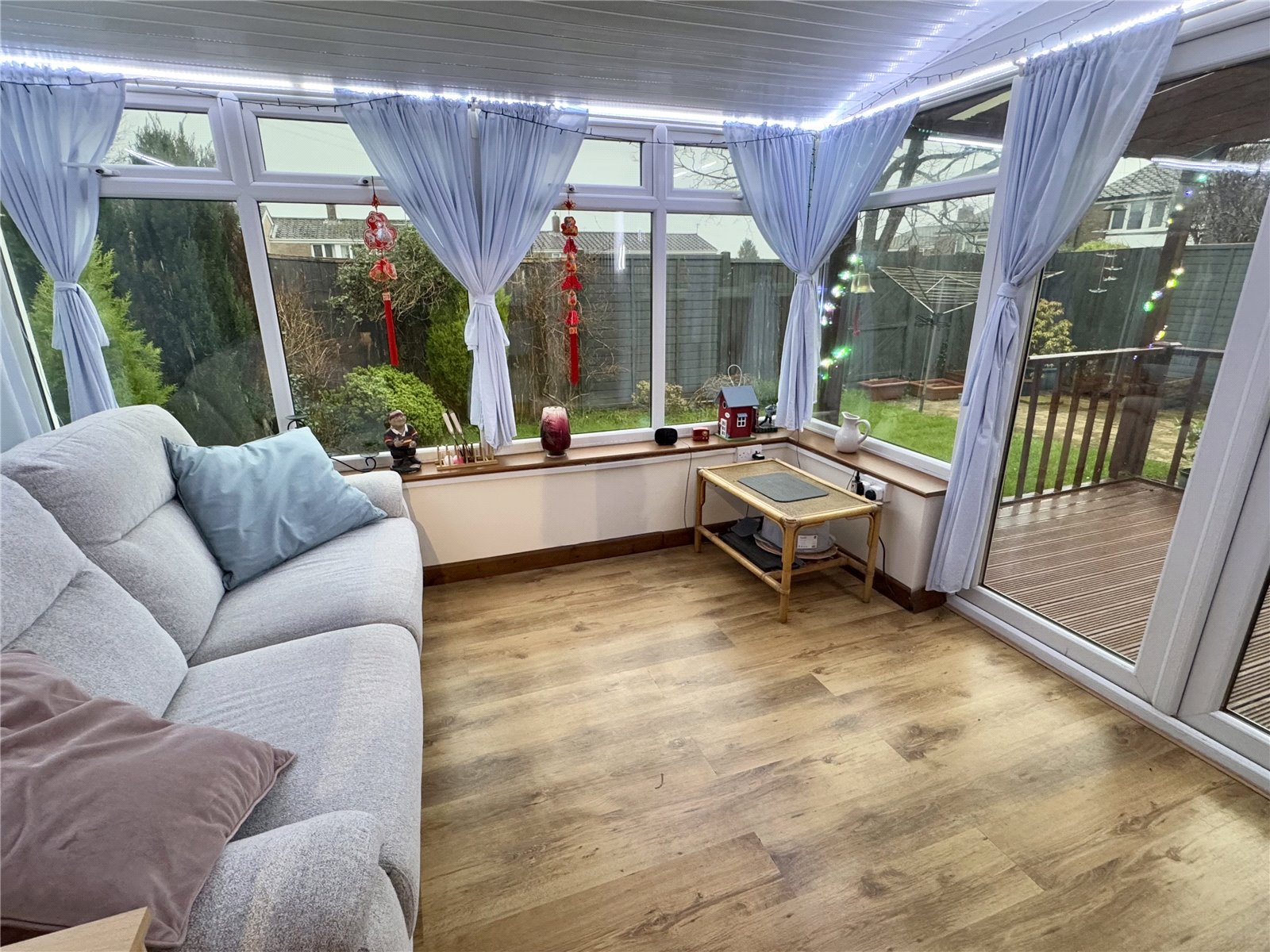 Rear The rear garden is a lovely level plot made up of areas of lawn, patio and a covered decked seating area. The whole garden is enclosed by wooden fencing. The garden enjoys a high degree of privacy backing on to a communal green area.