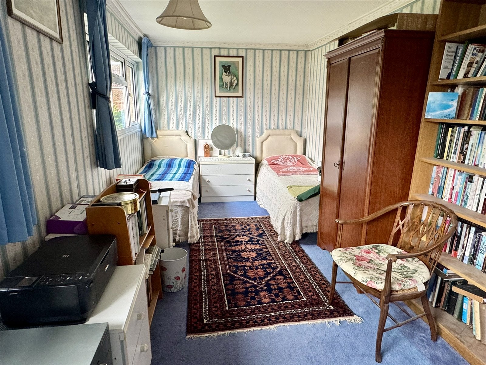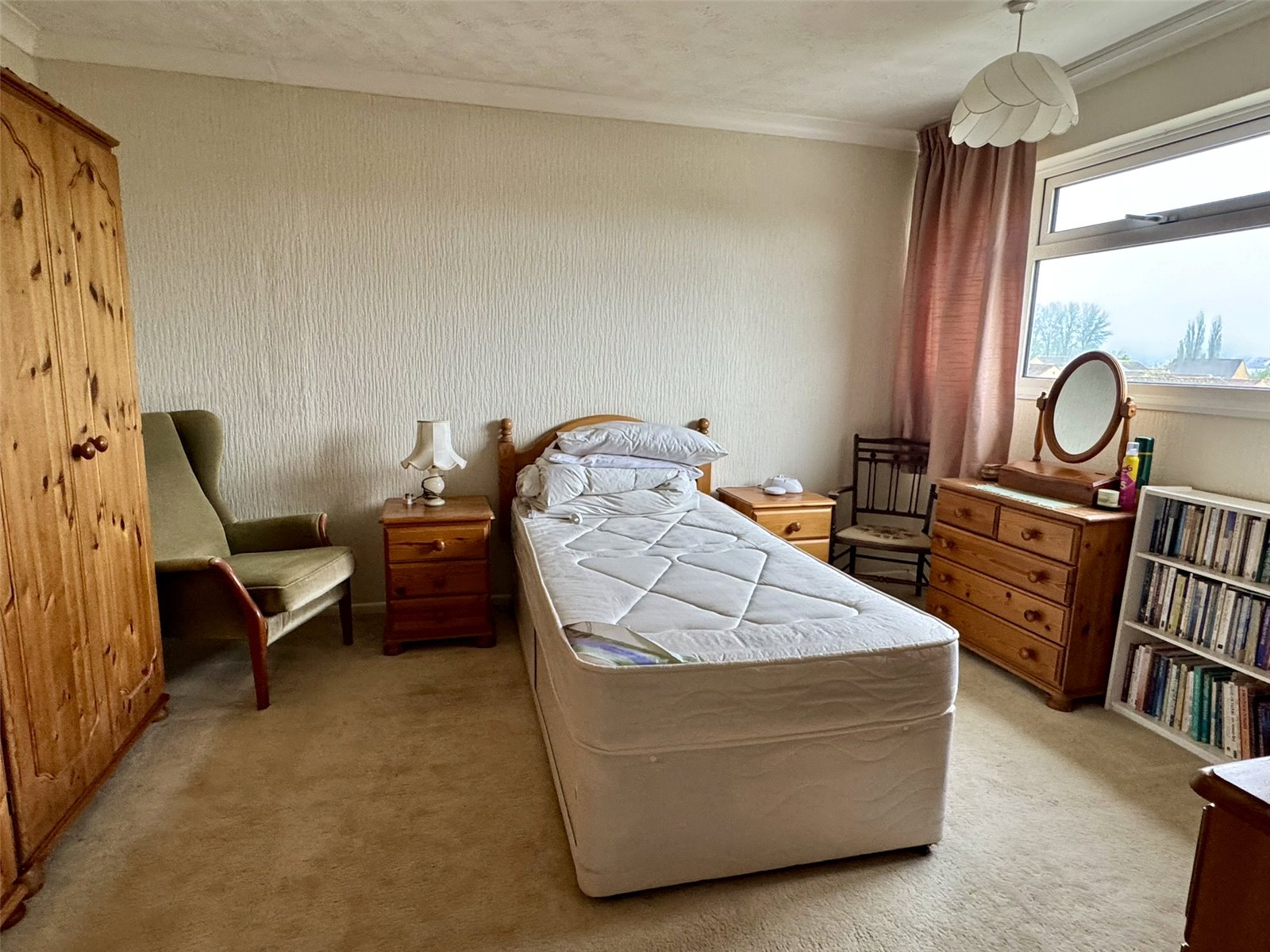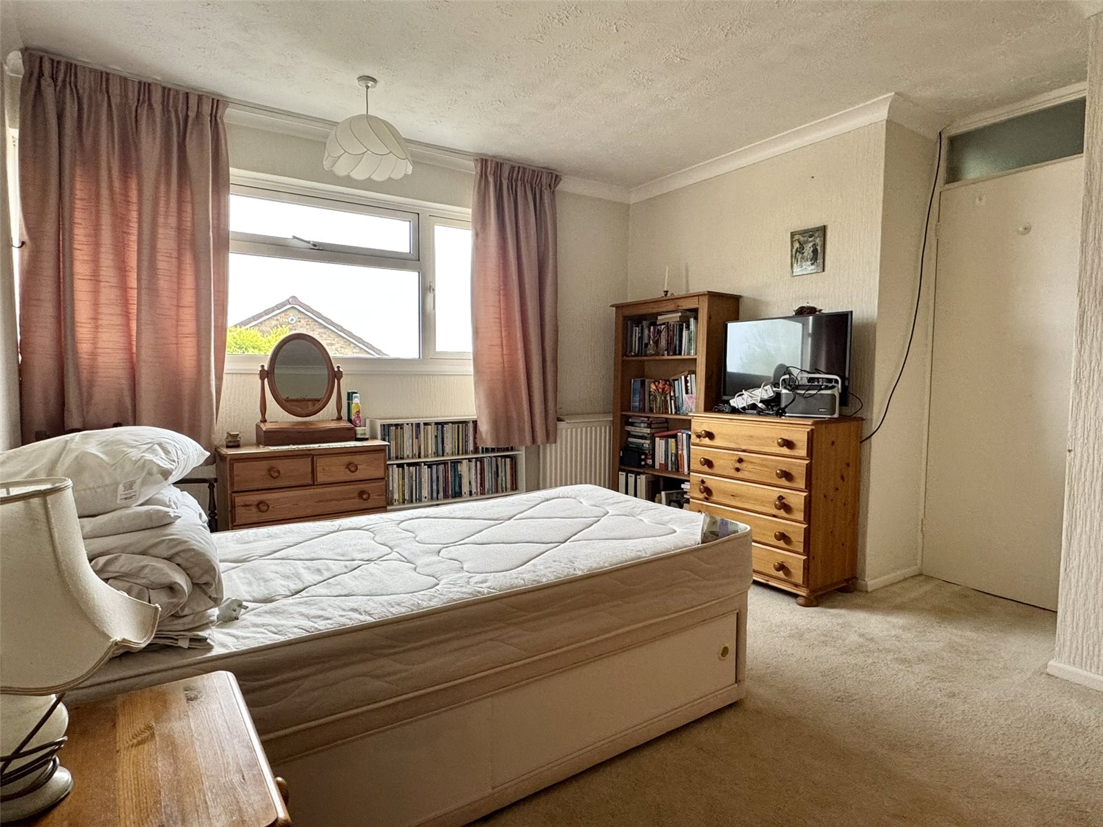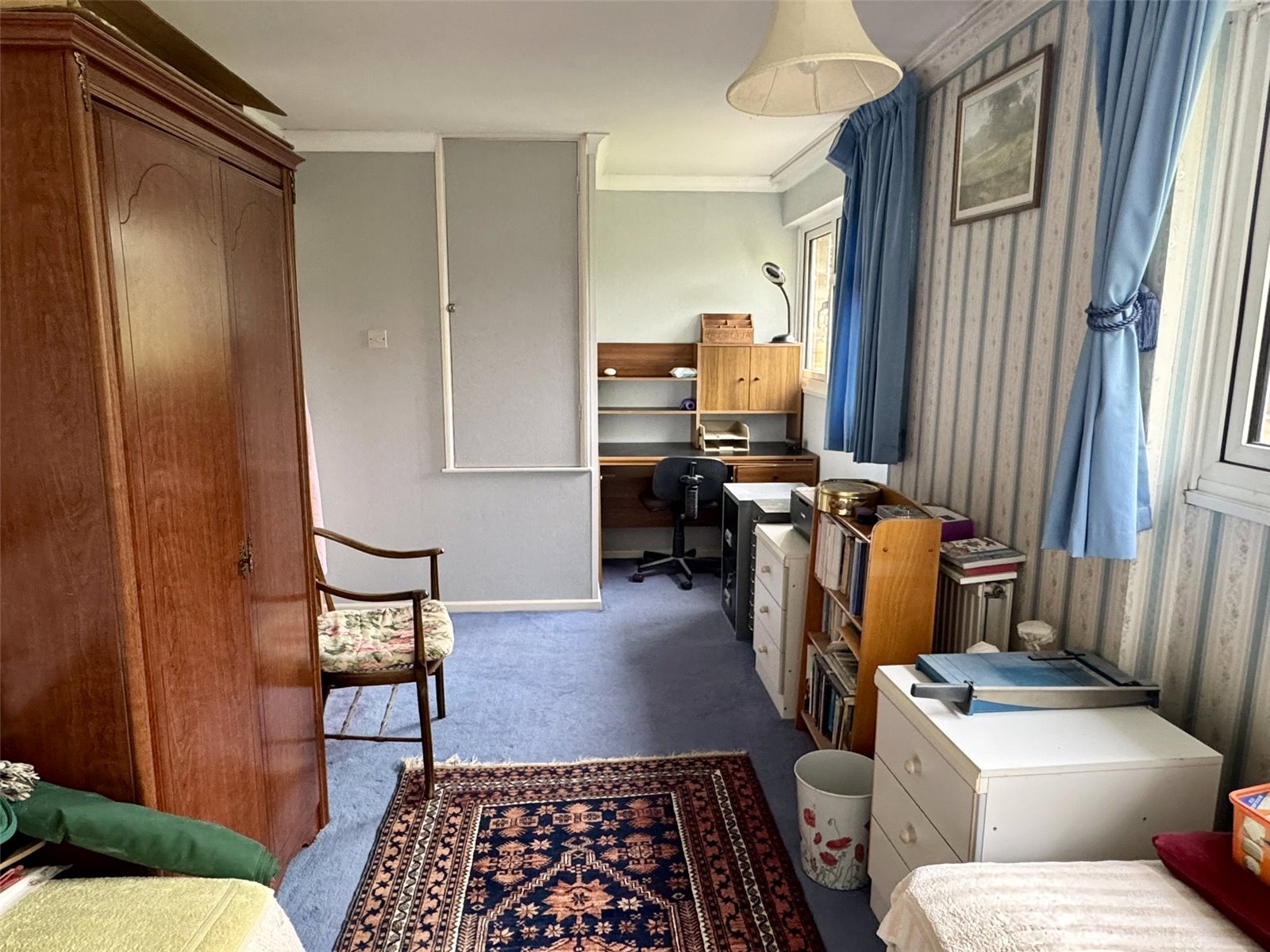 Bedroom Two 18'5" (5.62m) narrowing to 15'4" (4.68m) x 8'3" (2.52m) into recess. Built-in storage cupboard overstairs, radiator and two double glazed windows to the front aspect.