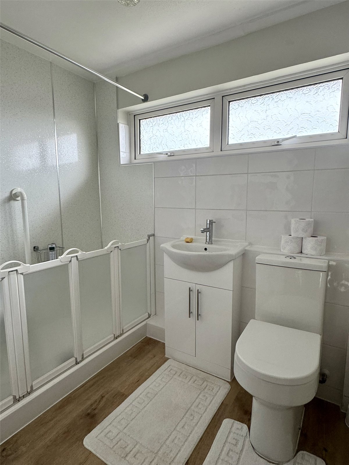Shower Room Walk-in shower cubicle with mains shower and panelled splashbacks. Inset wash hand basin with vanity unit under, low-level W.C. Radiator and opaque double glazed window to the rear aspect.