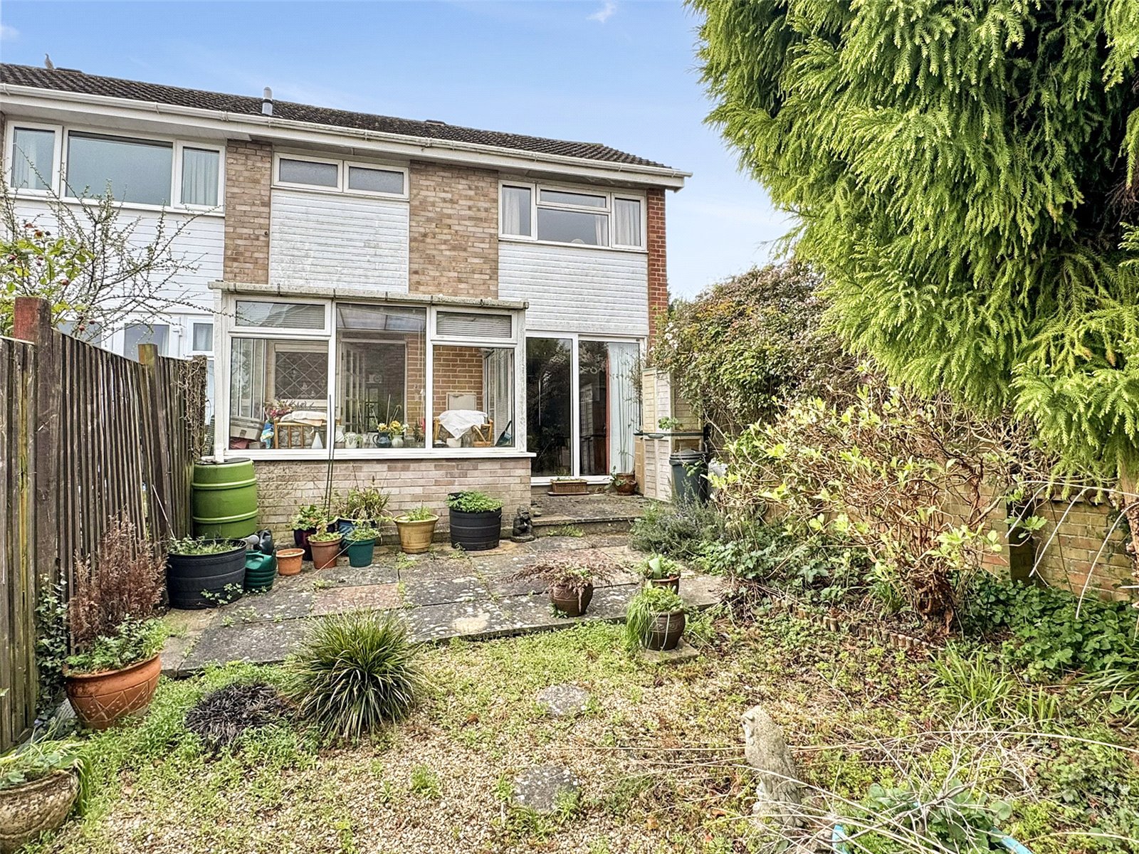 This two double bedroom end-terraced property is offered to the market with the added advantage of no onward chain, presenting an excellent opportunity for buyers seeking a home with potential to modernise and add value.The ground floor accommodation is well-proportioned, featuring a spacious lounge diner that enjoys a pleasant dual aspect, allowing for plenty of natural light throughout the day. Sliding doors provide direct access to the rear garden, creating a seamless connection between indoor and outdoor living. The fitted kitchen leads through to a conservatory, offering additional versatile space that could be used as a dining area or garden room.To the first floor, there are two generously sized double bedrooms, both served by a shower room. Of particular note is the large front bedroom, which offers scope to be reconfigured into two separate bedrooms, subject to the necessary consents, making it an appealing prospect for growing families or those looking to maximise space.Externally, the property benefits from gardens to three sides, thoughtfully arranged with a combination of lawn, paved areas, stone chippings, and established planting, providing a pleasant outdoor setting with plenty of potential for further enhancement. A wooden gate to the rear gives access to a single garage, with additional parking available in front.Further benefits include double glazing and gas central heating, ensuring comfort and efficiency throughout the year.