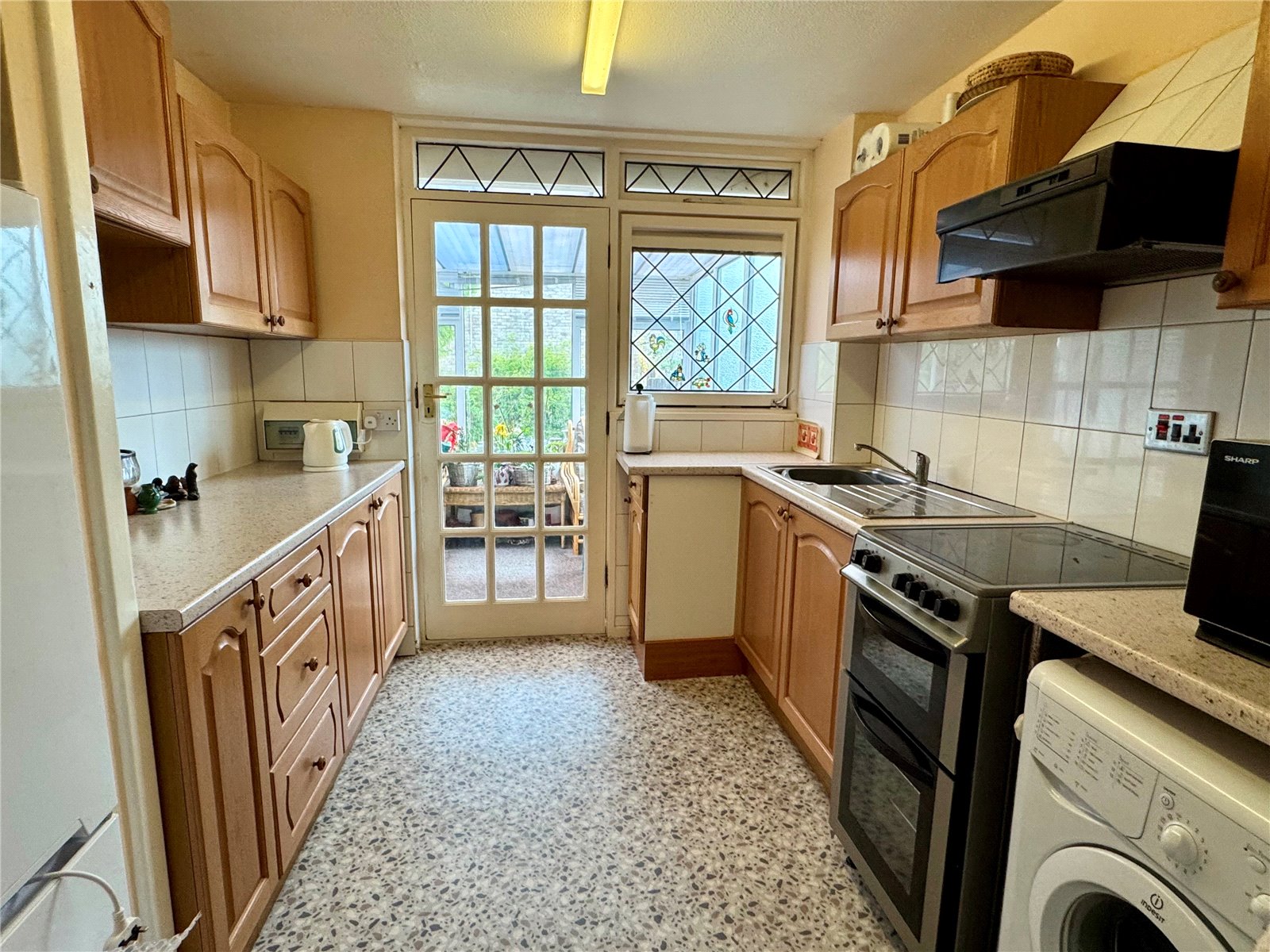 Kitchen 8'11" x 8'6" (2.72m x 2.6m). Fitted with wall and base units set beneath worktops with inset sink and drainer. Space for cooker and fridge freezer, space and plumbing for washing machine. Hatch to lounge/diner. Wooden glazed door and side window out to conservatory.