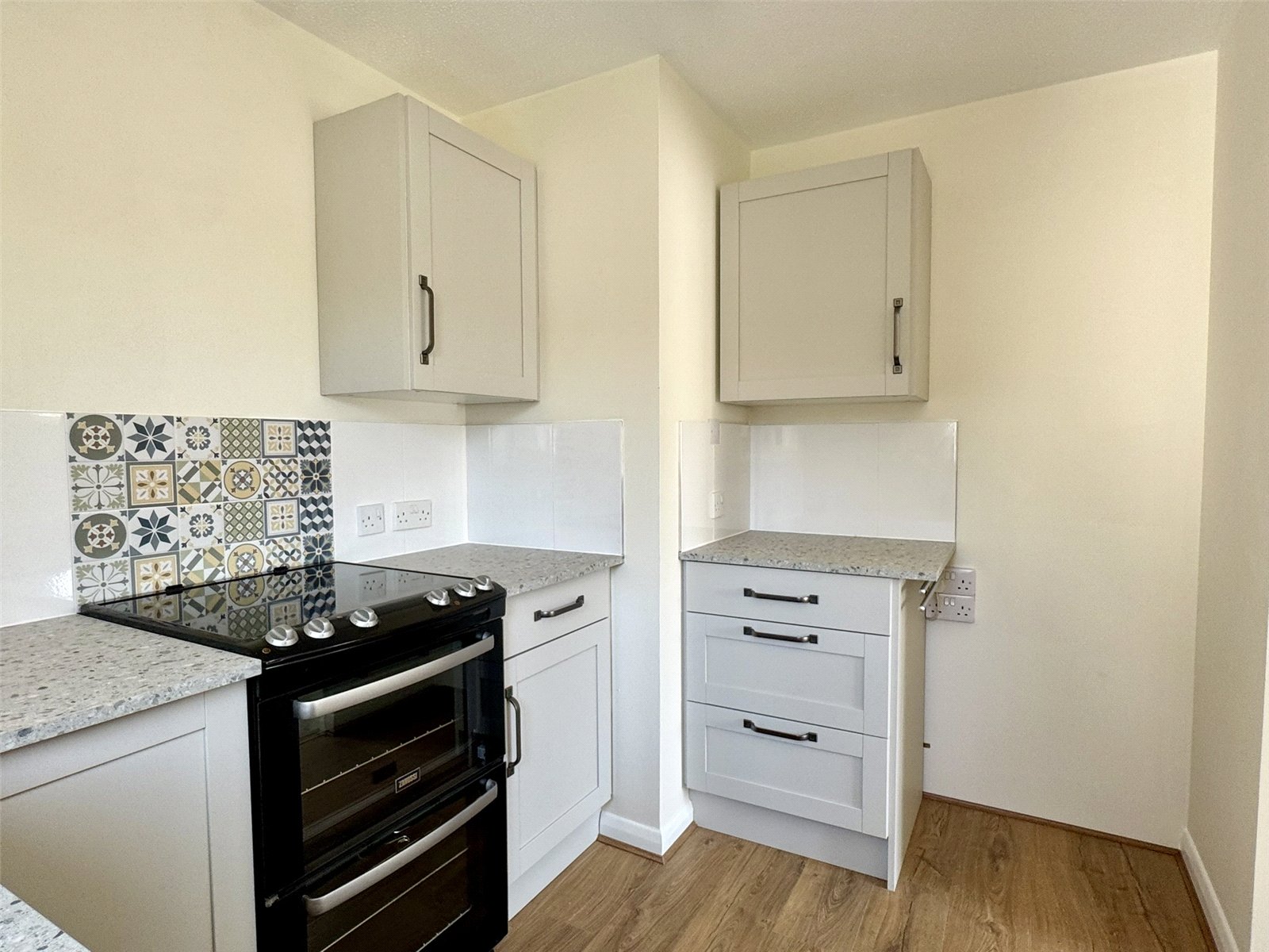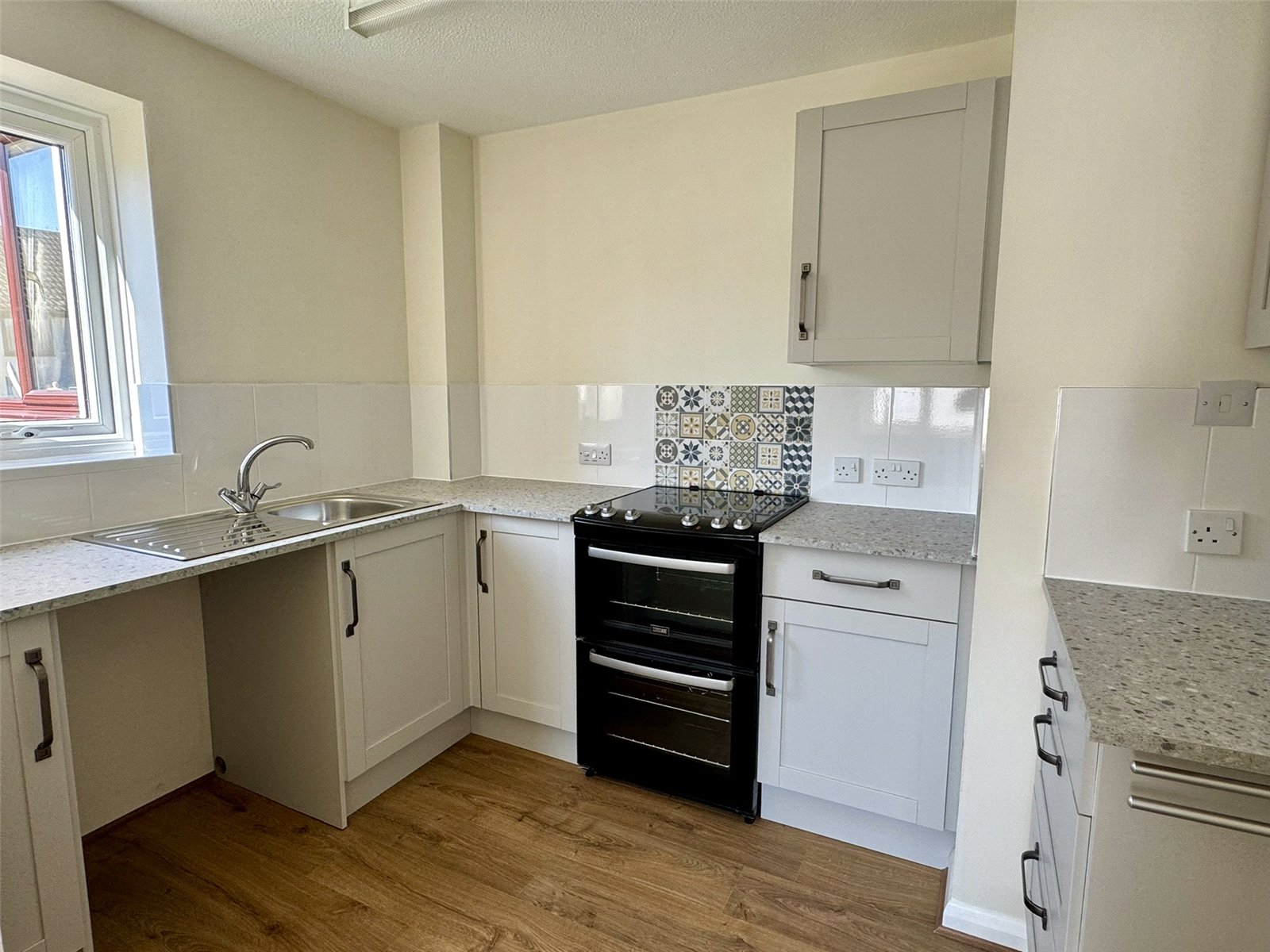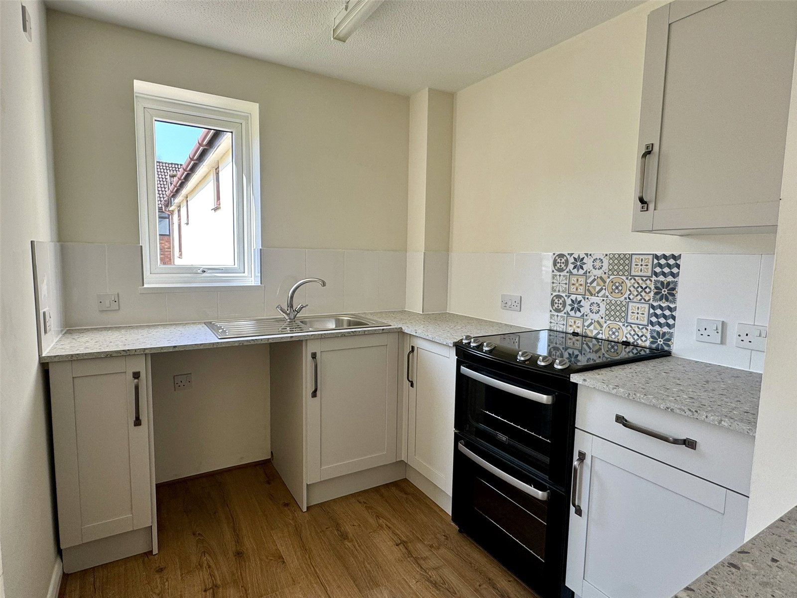 Kitchen 6'11" (2.12m) x 9'7" (2.93m) narrowing to 7'2" (2.19m). Newly fitted with modern wall and base units set beneath worktops with inset sink and drainer with mixer tap. Electric oven. Space and plumbing for washing machine, space for fridge freezer. Double glazed window to the side aspect.
