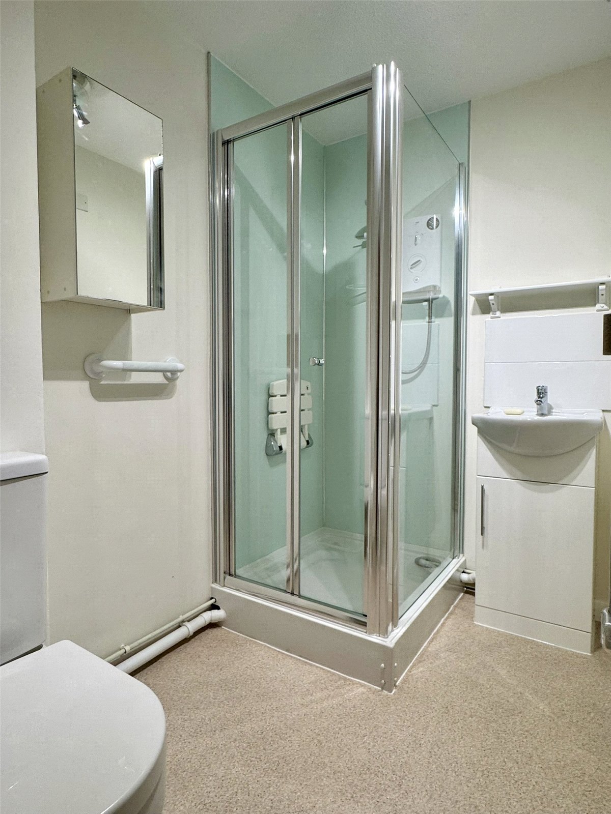 Shower Room Fitted with a modern three-piece suite comprising shower cubicle with electric shower and seat, inset wash hand basin with vanity unit under and low-level W.C. Extractor, electric heated towel rail.