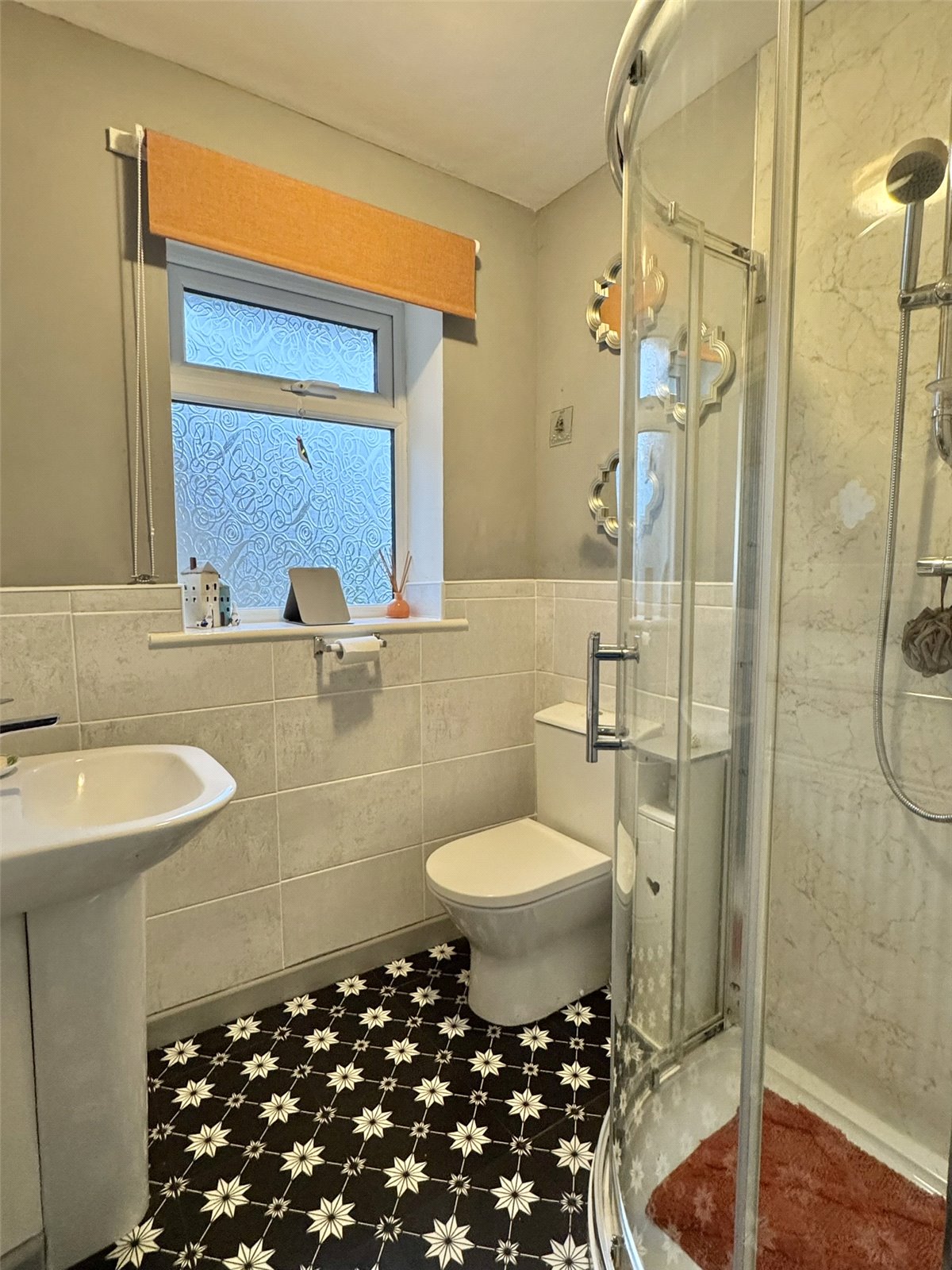 Shower Room Fitted with a modern three-piece suite comprising shower cubicle with mains shower, low-level W.C. and pedestal wash hand basin. Tiled splash backs, radiator, extractor and opaque double glazed window to the side aspect.