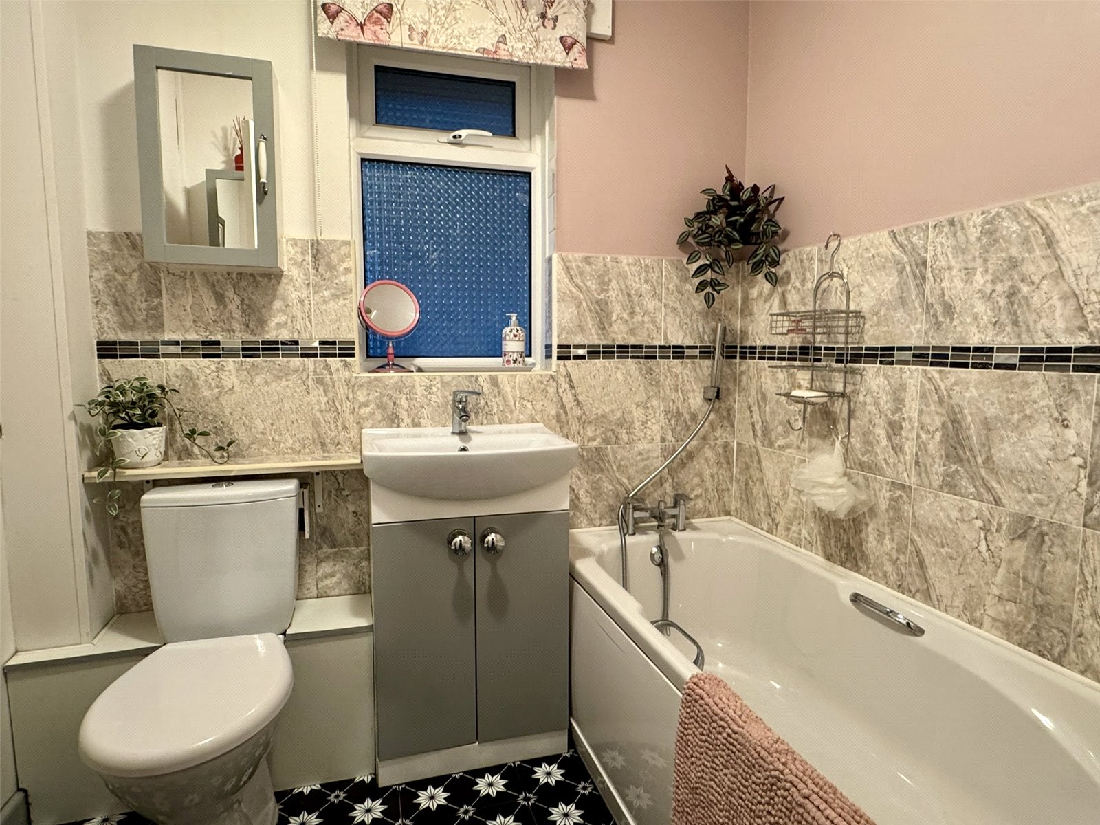Bathroom Fitted with a three-piece suite comprising panelled bath with shower attachment over, wall mounted wash hand basin with vanity unit under and low-level W.C. Radiator, tiled splashbacks, extractor and opaque double glazed window to the front aspect.