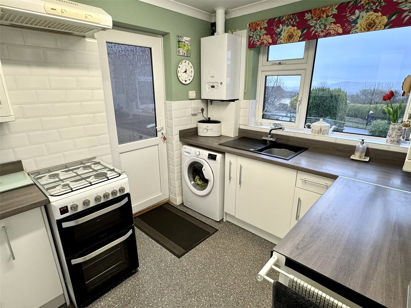 Kitchen 10'2" (3.11m) narrowing to 8'6" (2.59m) x 7'10" (2.39m). Fitted with a range of matching wall and base units set beneath worktops with inset sink and drainer. Space for fridge freezer, space for cooker, space and plumbing for washing machine. Wall mounted central heating boiler. Double glazed window to the front aspect and opaque double glazed door out to carport.