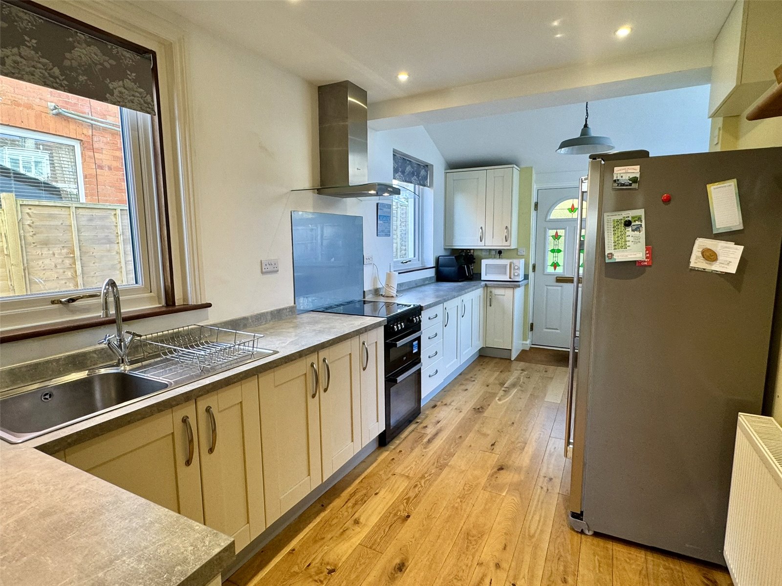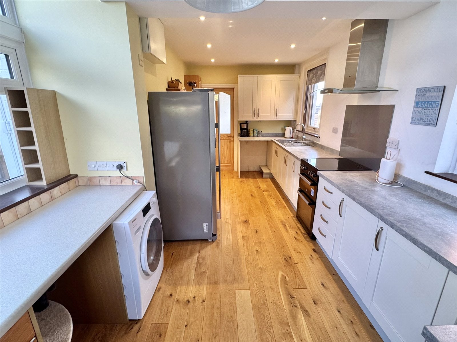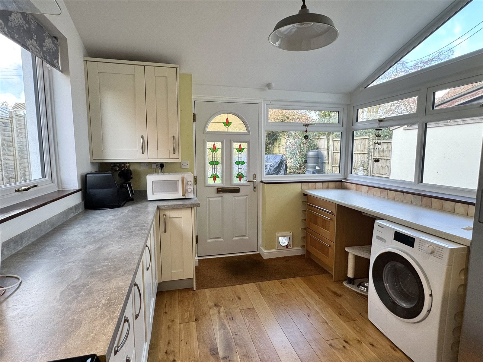 Kitchen/Breakfast Room 18'3" (5.56m) x 9'10" (2.99m) narrowing to 8'1" (2.47m). Fitted with a selection of wall and base units set beneath worktops with inset sink and drainer. Space for cooker, space for fridge freezer, space and plumbing for washing machine, space for tumble dryer. Radiator, spotlights, under unit lighting, radiator. Double glazed windows to the front and side aspects.
