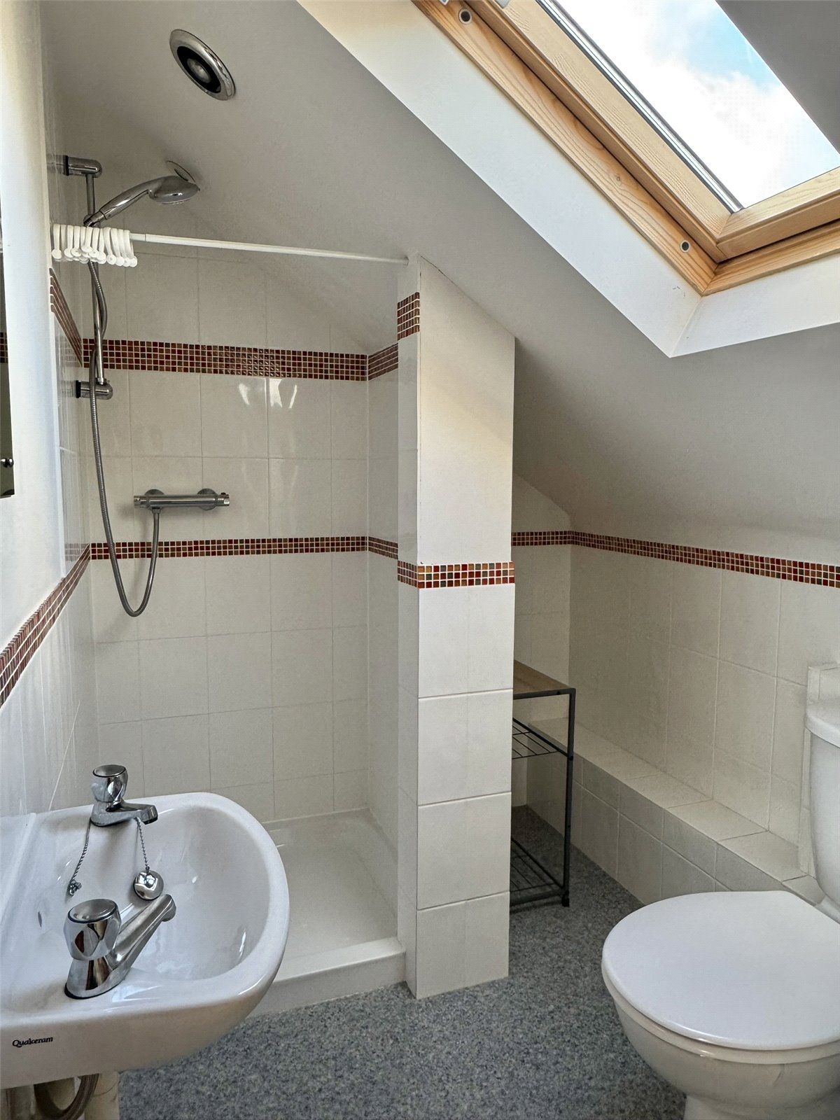 Ensuite Shower Room Fitted with a three-piece suite comprising shower cubicle with mains shower, low-level W.C. and wall mounted wash hand basin. Tiled splashbacks, extractor and Velux window to the front aspect.