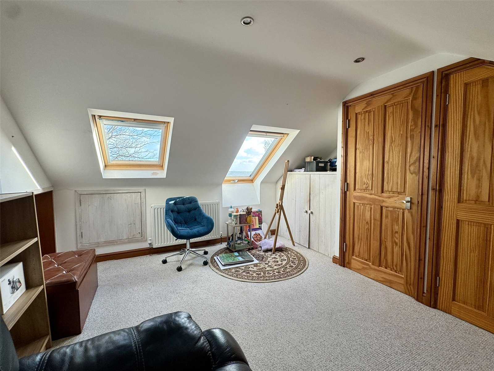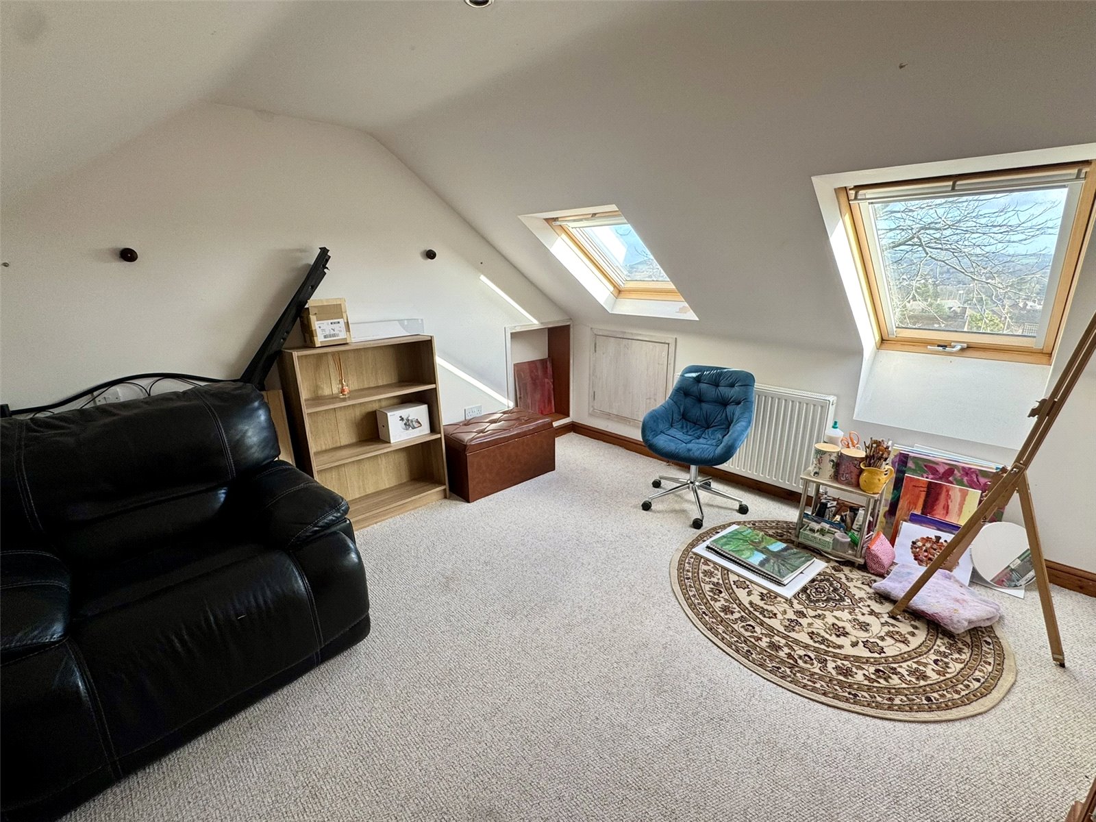 Bedroom One 13'8" (4.16m) x 10'6" (3.19m) sloping ceilings. Radiator, fitted storage cupboard, access to eaves storage. Two Velux windows to the rear aspect with views across rooftops and countryside beyond. Door to ensuite shower room.