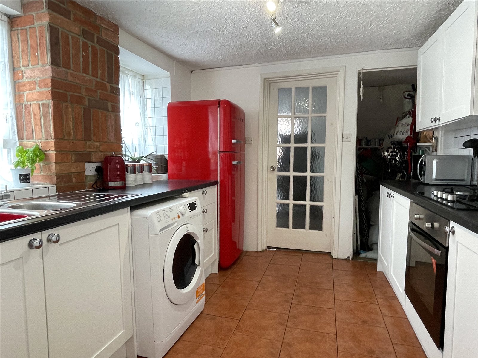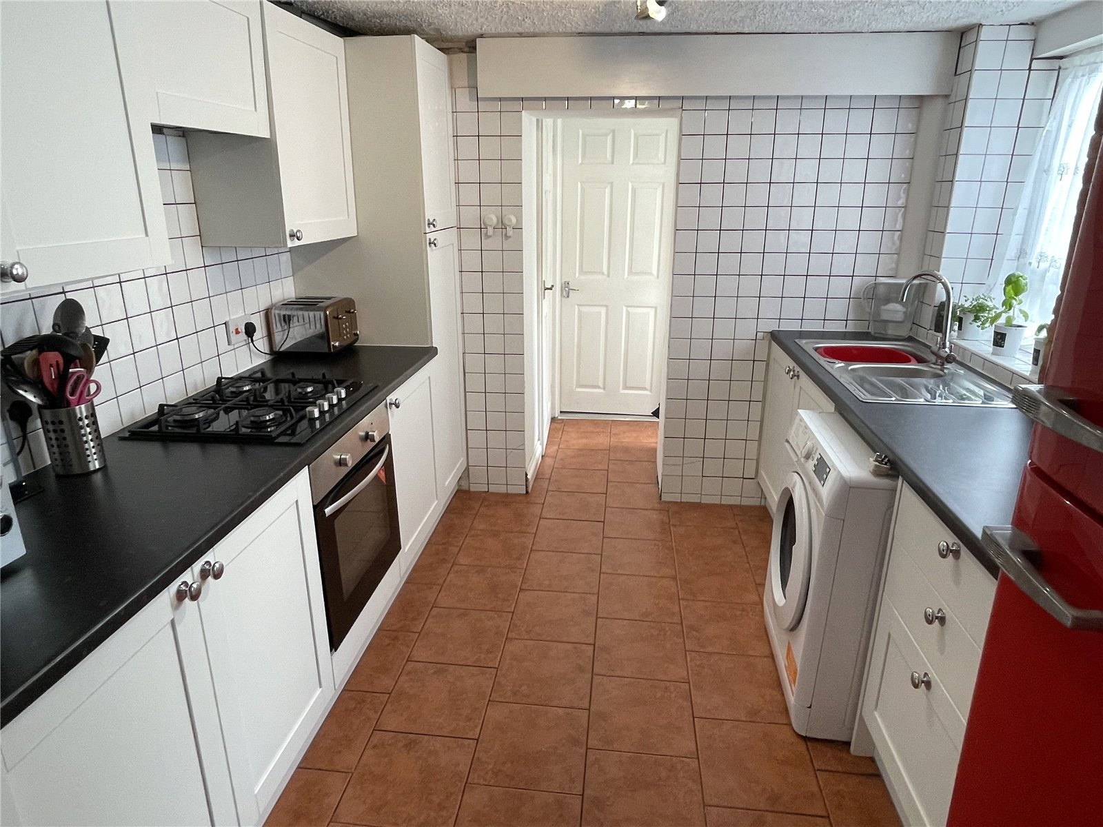 Kitchen 9'10" x 8'10" (3m x 2.7m). Recently refitted with new 'Howdens' wall and base units set beneath worktops with inset one and a half bowl sink and drainer. Space and plumbing for washing machine, space for fridge/freezer. Inset gas oven and hob. Storage cupboard understairs. Tiled flooring, tiled splash backs. Opening through to rear hall.