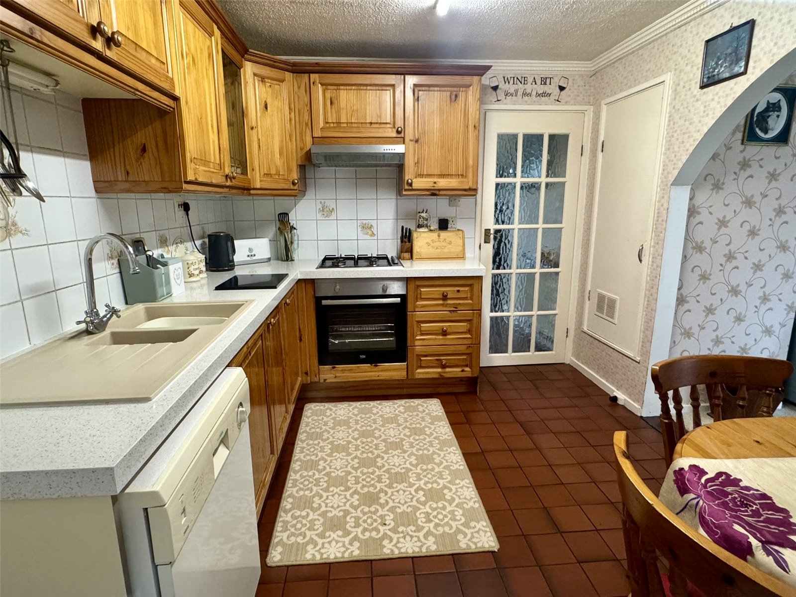 Kitchen 10'8" x 9' (3.25m x 2.74m). Fitted with a range of matching wall and base units set beneath worktops with inset sink and drainer. Integrated electric oven with gas hob and hood over. Space and pluming for dishwasher, space for fridge freezer. Built-in cupboard housing electrics. uPVC window and door out to Utility and opening through to lounge.