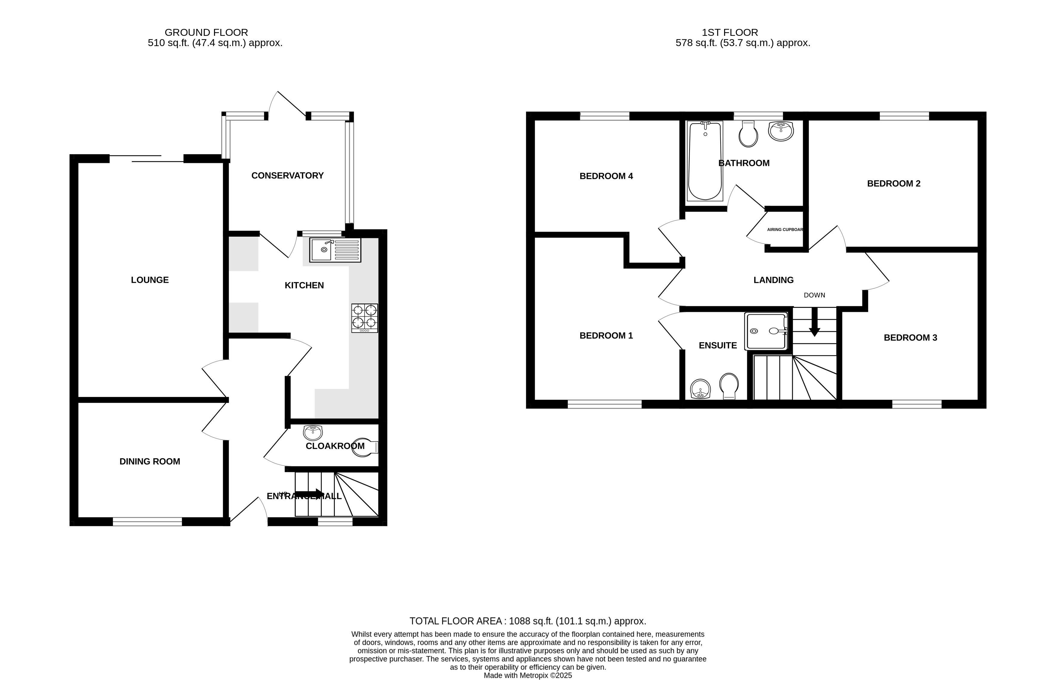 Accommodation comprises: Entrance hall, lounge, dining room, kitchen, cloakroom, conservatory, main bedroom with ensuite shower room, three further bedrooms and bathroom.