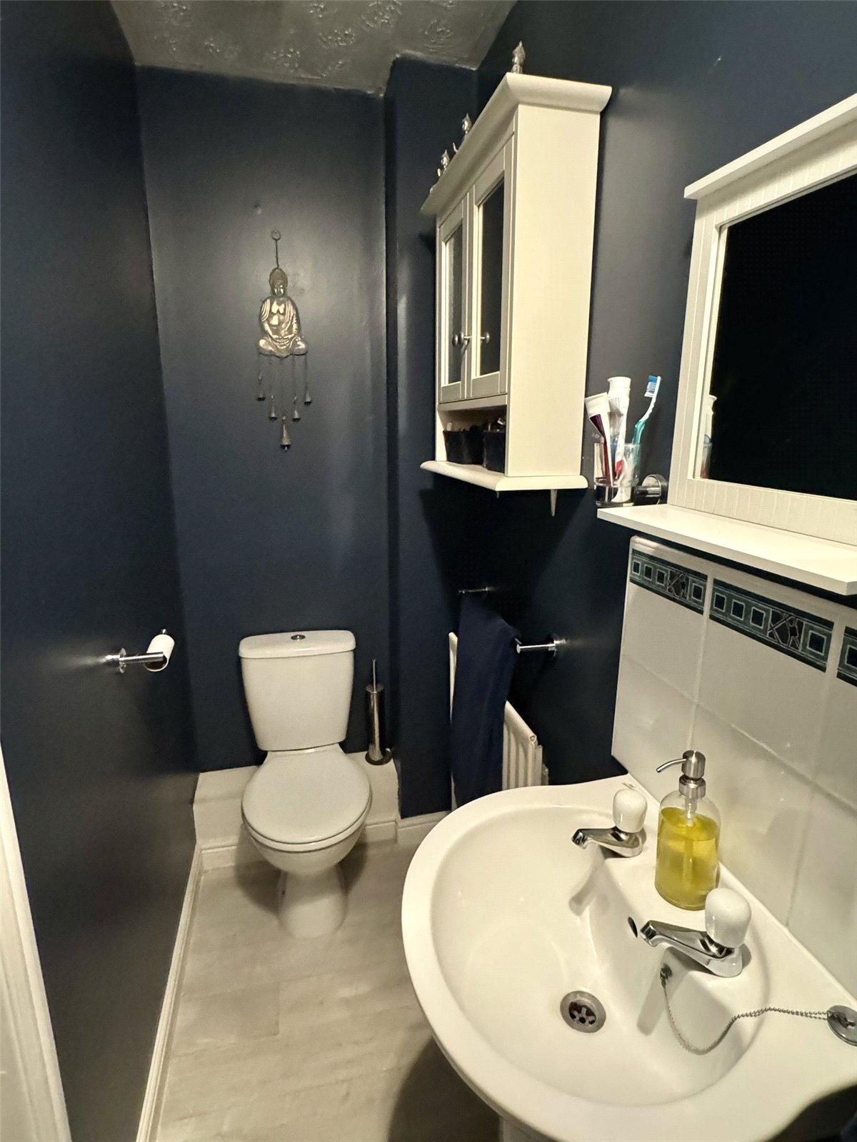 Cloakroom Fitted with a two-piece suite comprising low-level W.C. and corner wall mounted wash hand basin. Radiator and opaque double glazed window to the front aspect.
