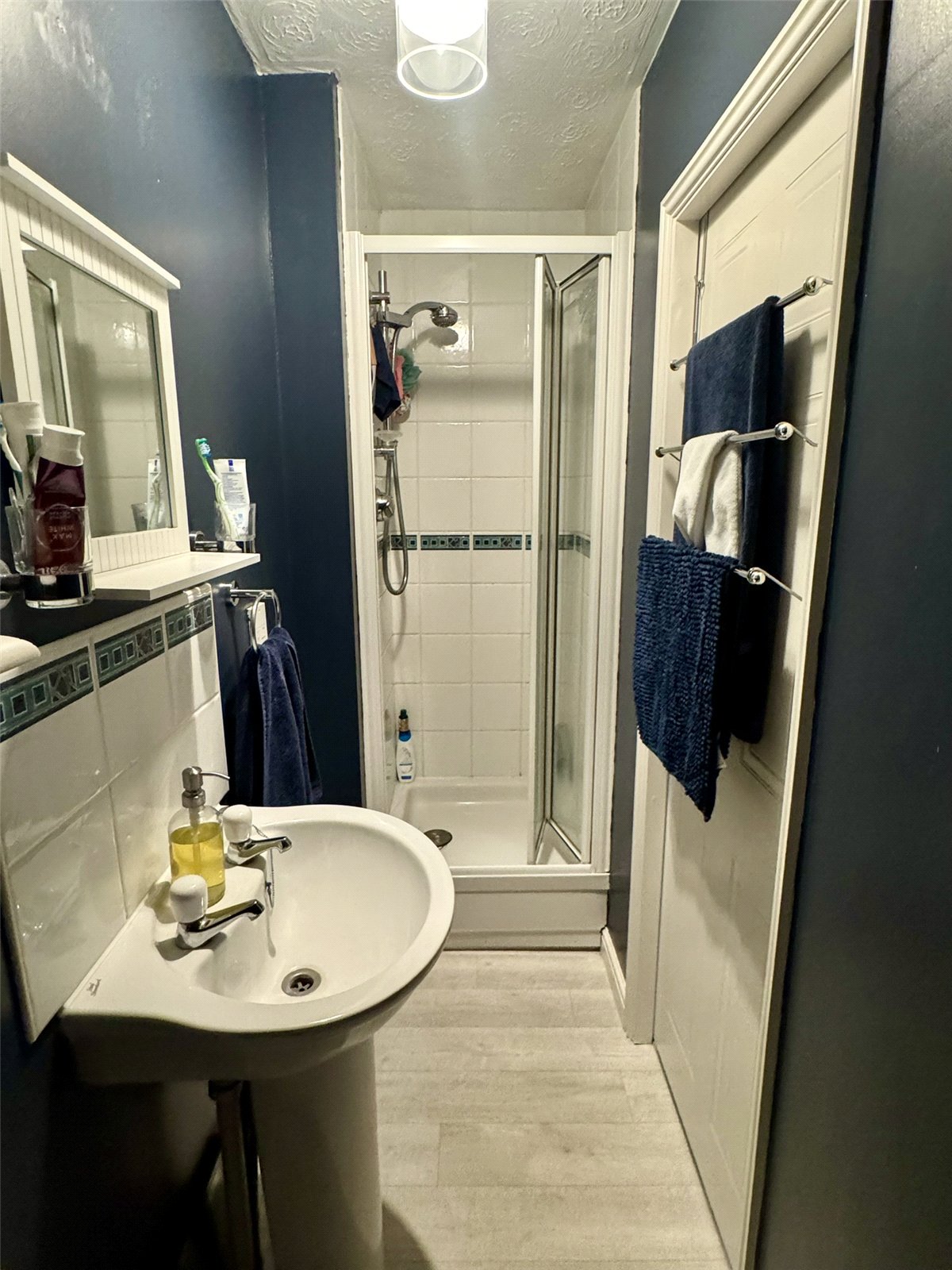 Ensuite Shower Room Fitted with a three-piece suite comprising shower cubicle with mains shower, pedestal wash hand basin and low-level W.C. Extractor, radiator, shaving point and tiled splashbacks.