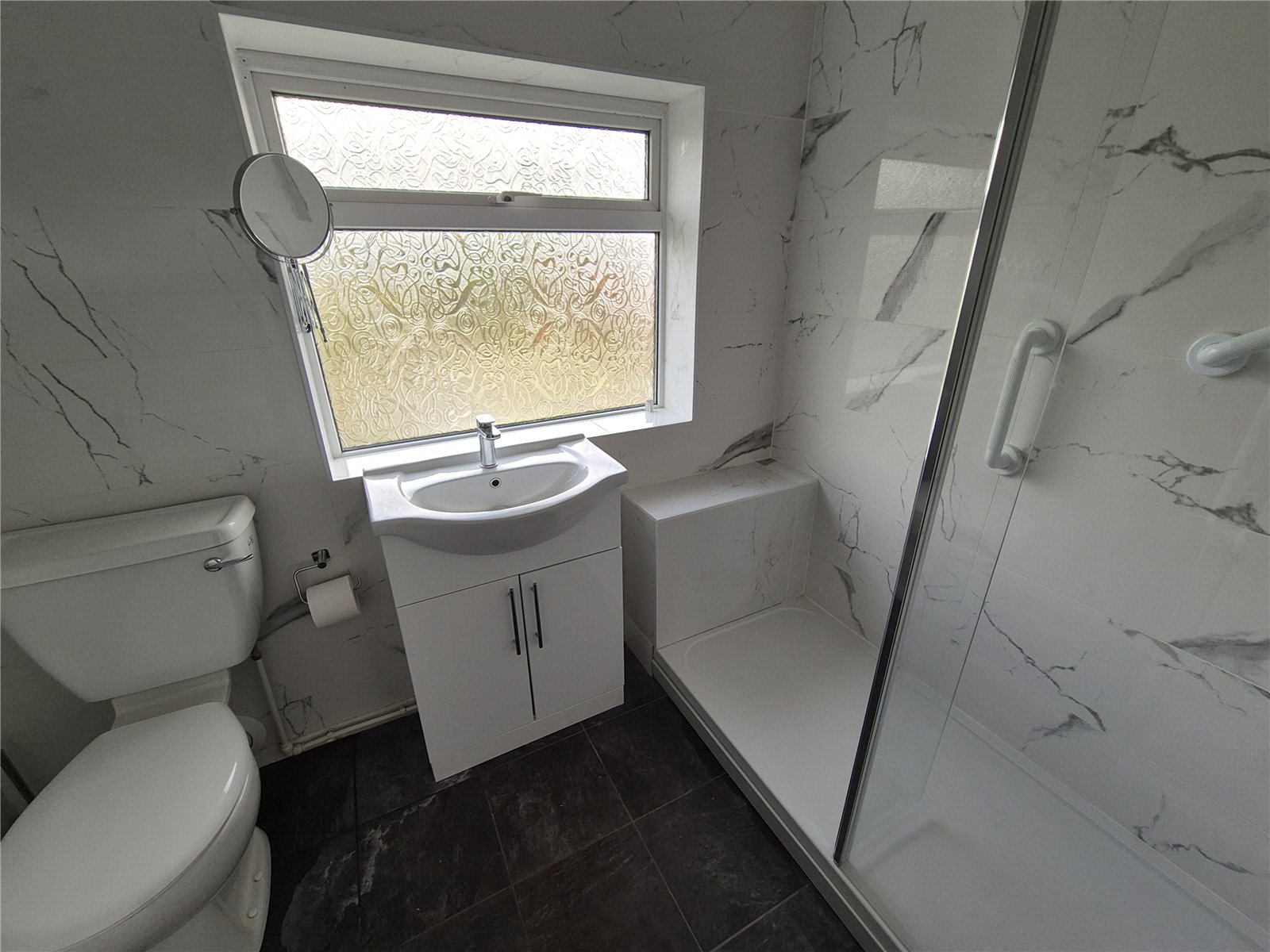 Shower Room Benefiting a three piece suite comprising of a shower, wash hand basin with storage below and low level W.C. Ceramic tiling, radiator and uPVC double glazed window.