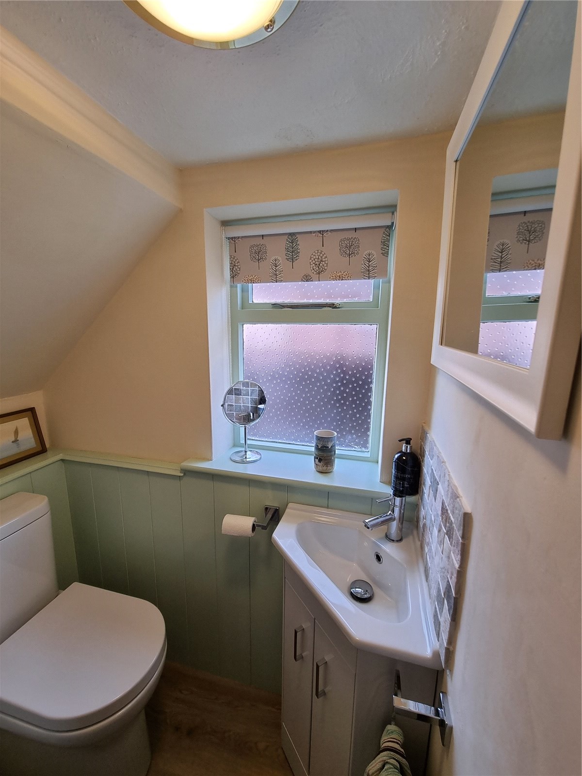 Cloakroom Coats hanging space, low level W.C, wash hand basin with storage below, radiator and window.
