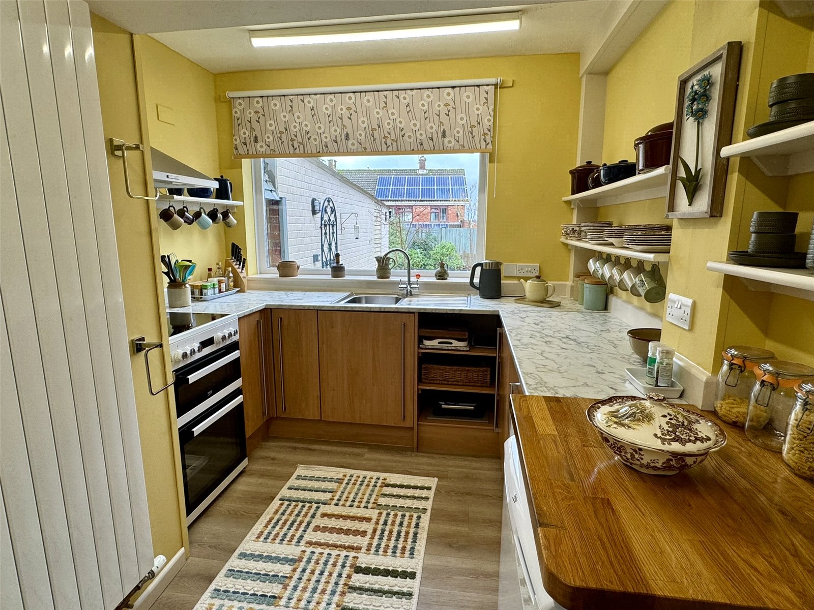 Kitchen 14'9" x 8'6" (4.5m x 2.6m). Fitted with a range of matching wall and base units with adjoining work top preparation surface and inset stainless steel sink and drainer with mixer tap over. Appliance space for cooker with cooker hood over, fridge/freezer, washing machine, tumble dryer and slim line dishwasher. Radiator, uPVC double glazed window and uPVC double glazed door giving access to the carport.