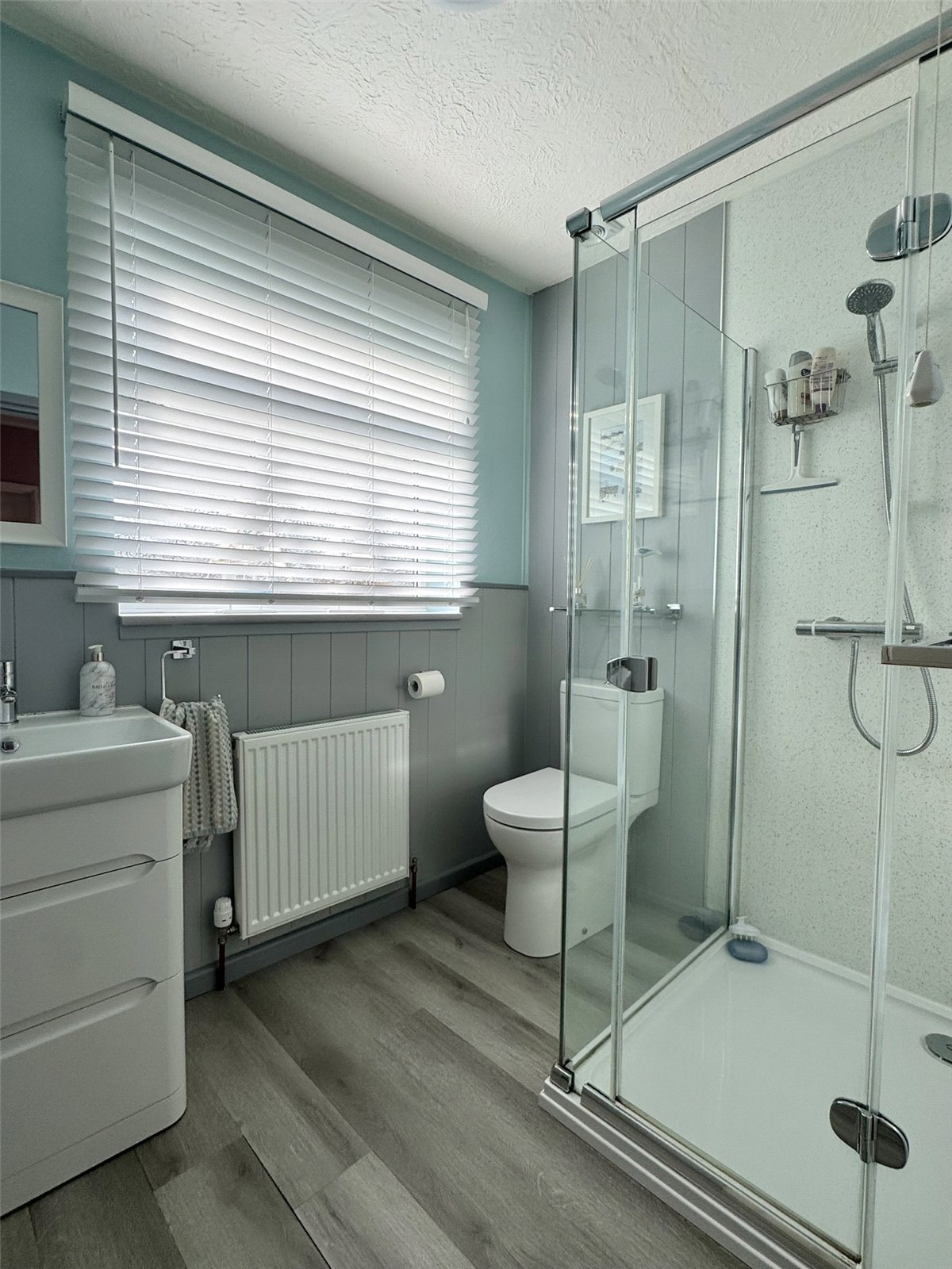 Shower Room Benefiting a modern three piece suite consisting of a shower cubicle with mains shower, low level W.C and wash hand basin with storage below. Radiator, extractor and uPVC double glazed window.