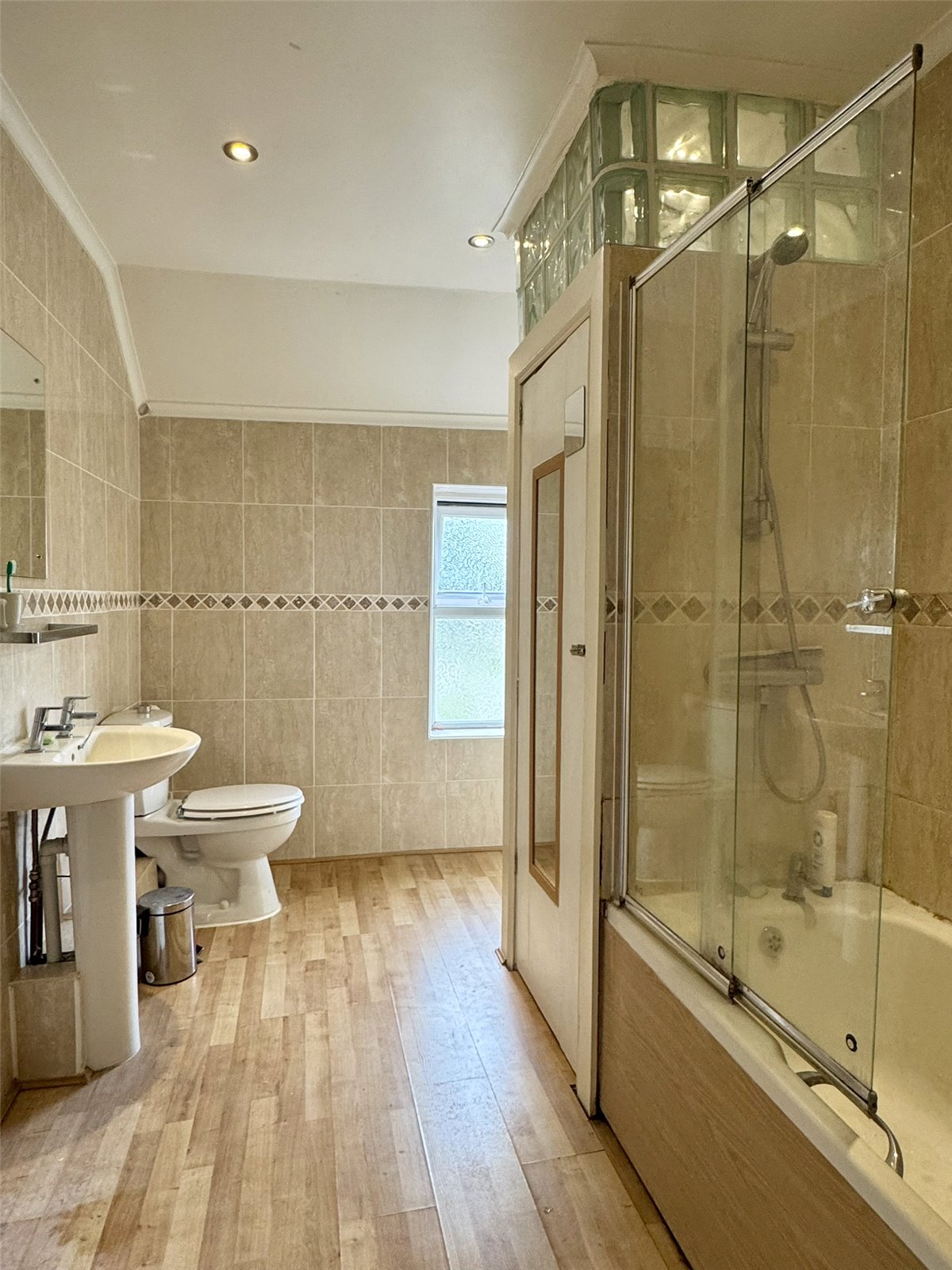 Bathroom Fitted with a three piece suite consisting of panelled bath with mains shower and screen, pedestal wash hand basin and low level W.C. Heated towel rail, built in storage cupboard and opaque double glazed window to the rear aspect.