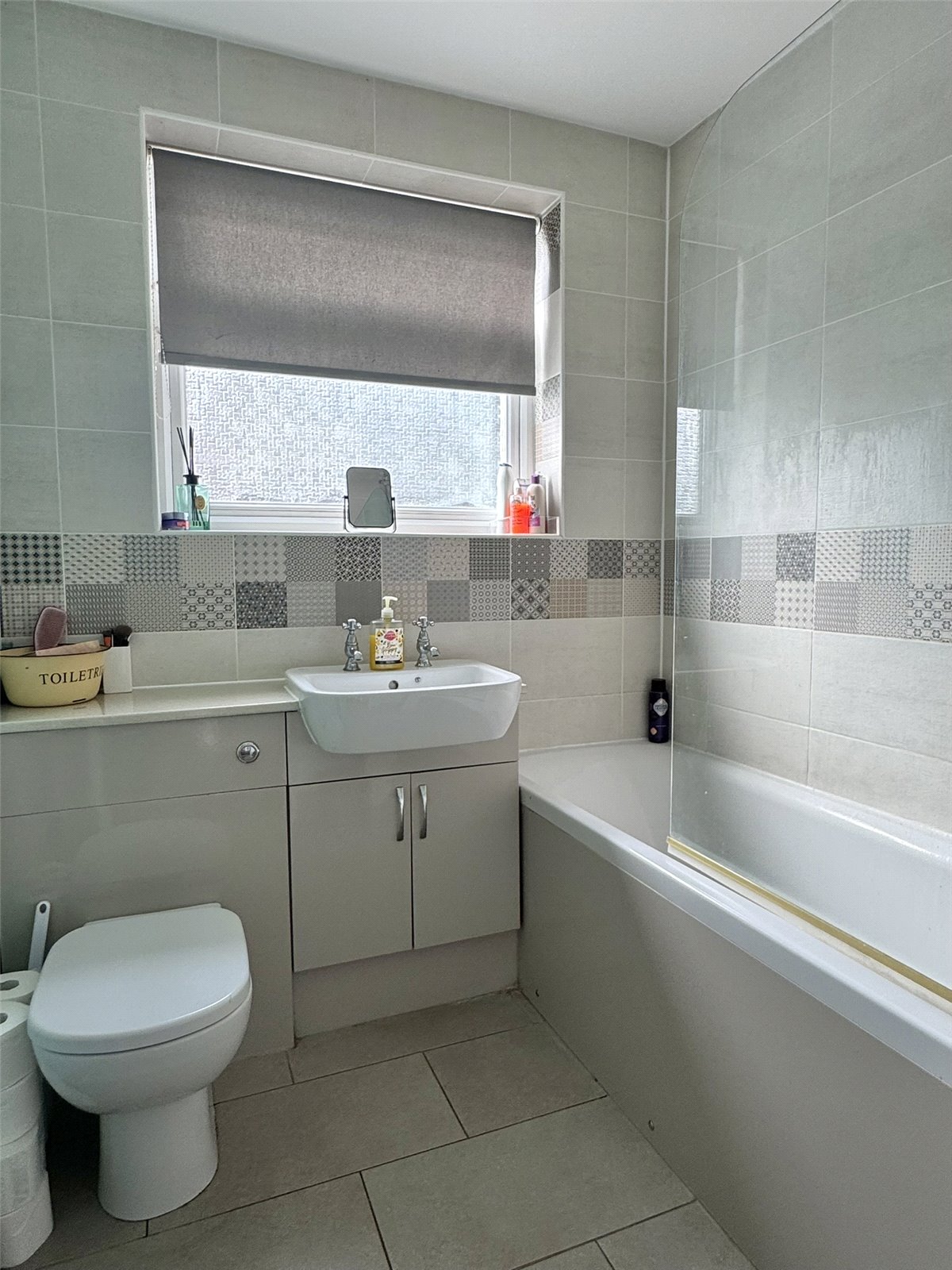 Bathroom Fitted with a three-piece suite comprising panelled bath with shower and screen over, inset wash and basin with vanity unit under, back-to-wall W.C. Heated towel rail, extensive tiling and opaque double glazed window to the side aspect.