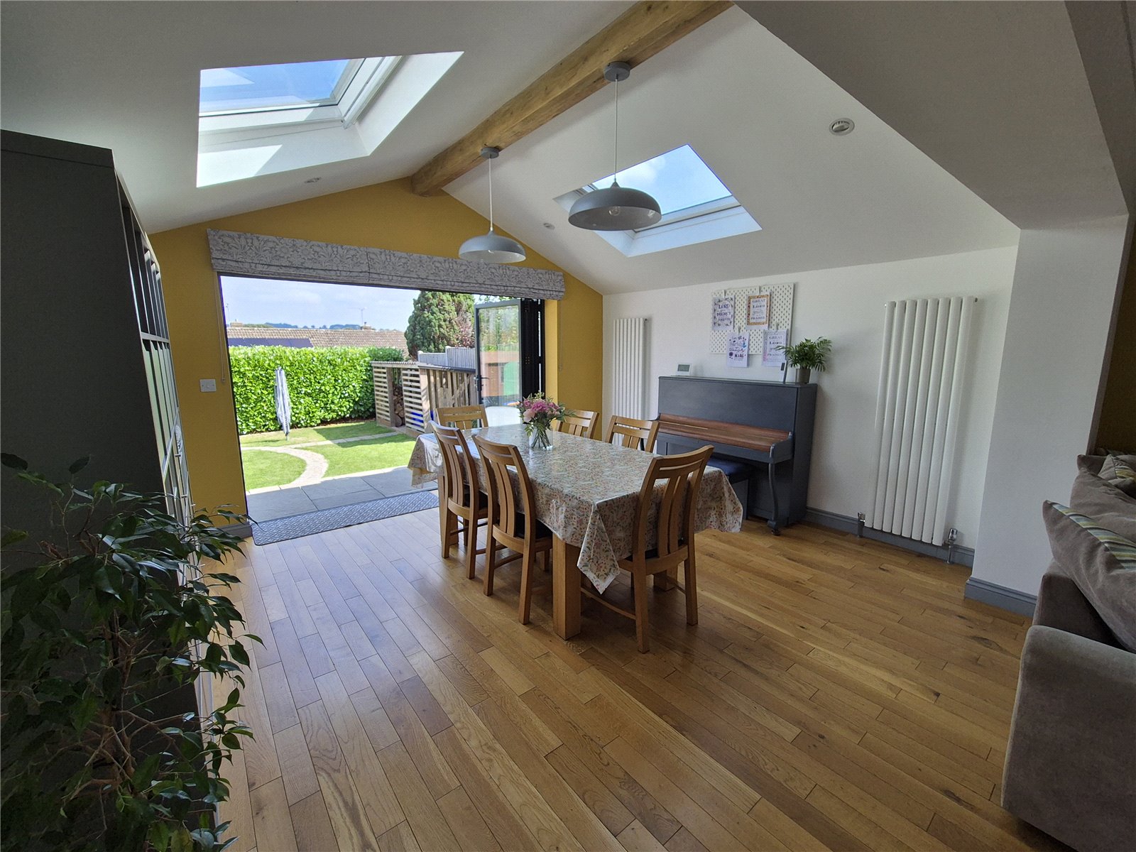 Dining Area 14'2" x 11'9" (4.32m x 3.58m). Vaulted ceiling with two Velux windows and exposed wooden beam, engineered Oak flooring, two modern radiators and bi-folding doors opening out to garden.