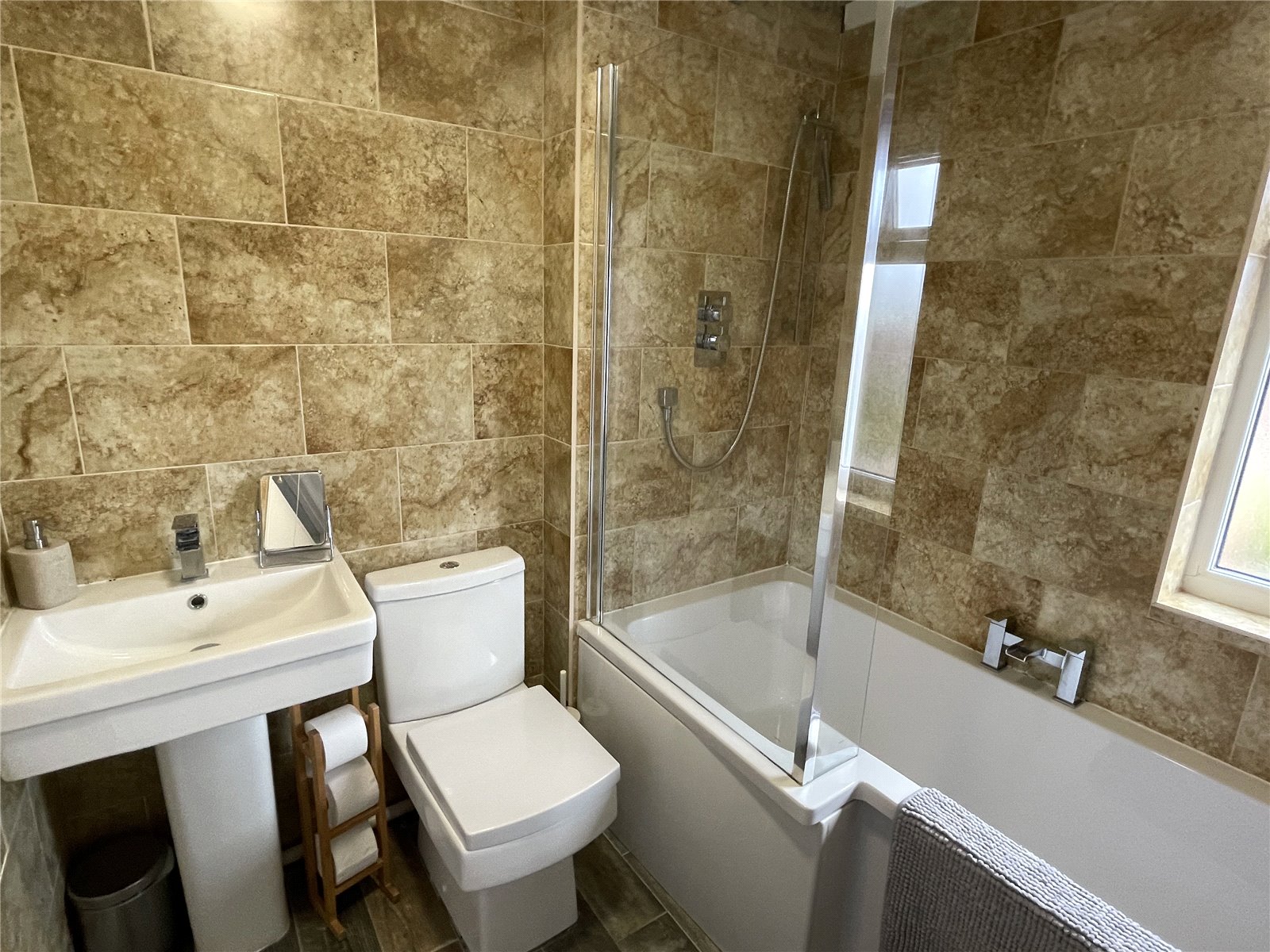 Bathroom Fitted with a modern suite consisting of 'p ?shaped panelled bath with mains shower, shower screen, shower attachment and rainfall shower head over, low level W.C and pedestal wash hand basin. Extensive tiling, heated towel rail and opaque double glazed window to the rear aspect.