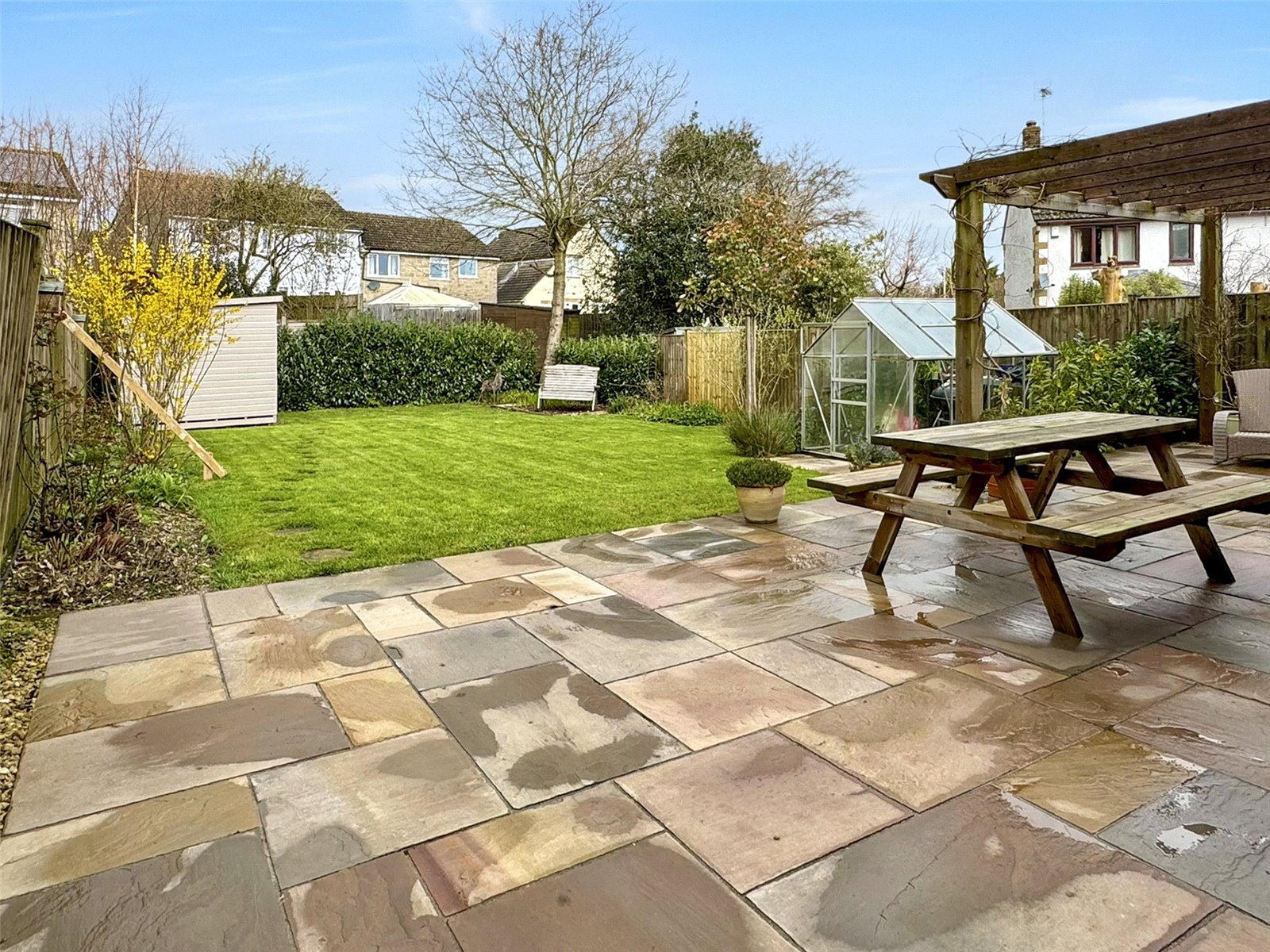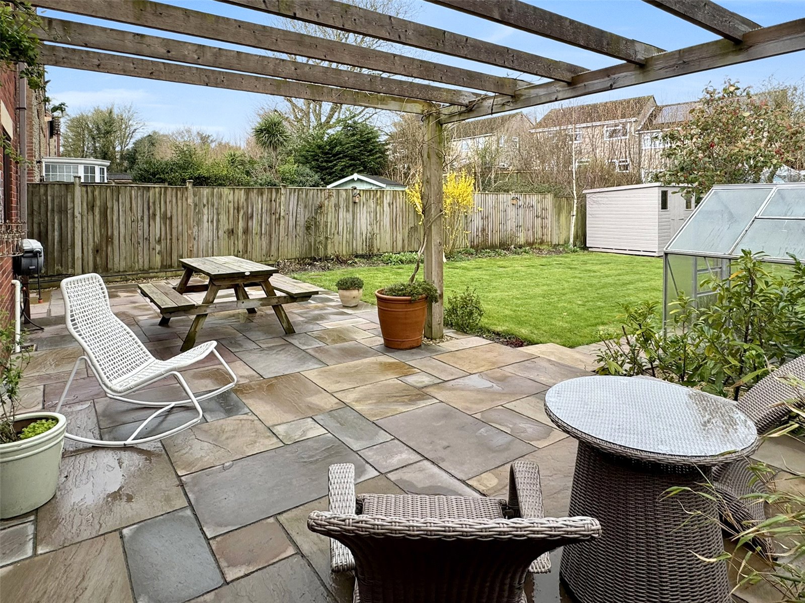 Rear Garden The beautifully landscaped rear garden is a spacious level plot made up of a large paved patio with wooden Pergola whilst continuing along the rear of the garage with personal door into the garage. A large lawn makes up the majority of the garden with paved stepping stones leading to a wooden shed with light and power with a selection of flower borders. A paved pathway leads to a greenhouse. Outside tap, security lighting and a selection mature flower borders.